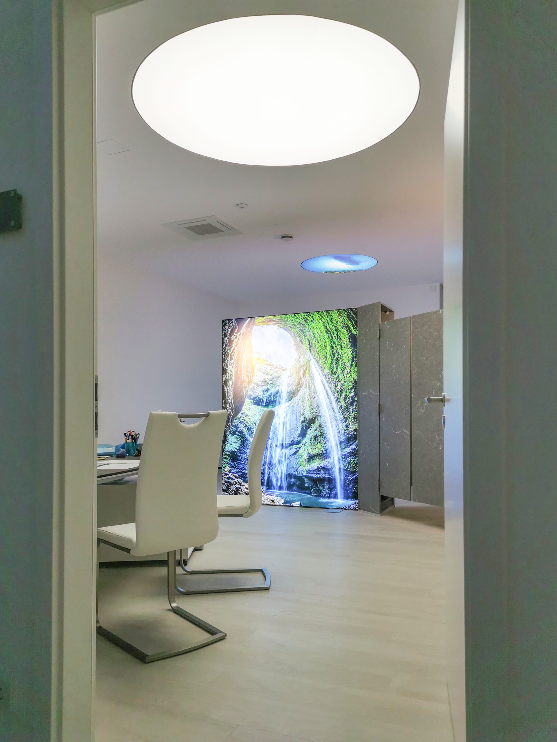 Para iluminar el centro, se han usado las tiras LED RGBW y WW, se han instalado para obtener una iluminación indirecta en los techos. En función del ambiente que quiera generarse en cada sala, permiten combinar diferentes intensidades y tonalidades de color. Además, puede guardarse más de una escena y activarla cuando sea necesario.