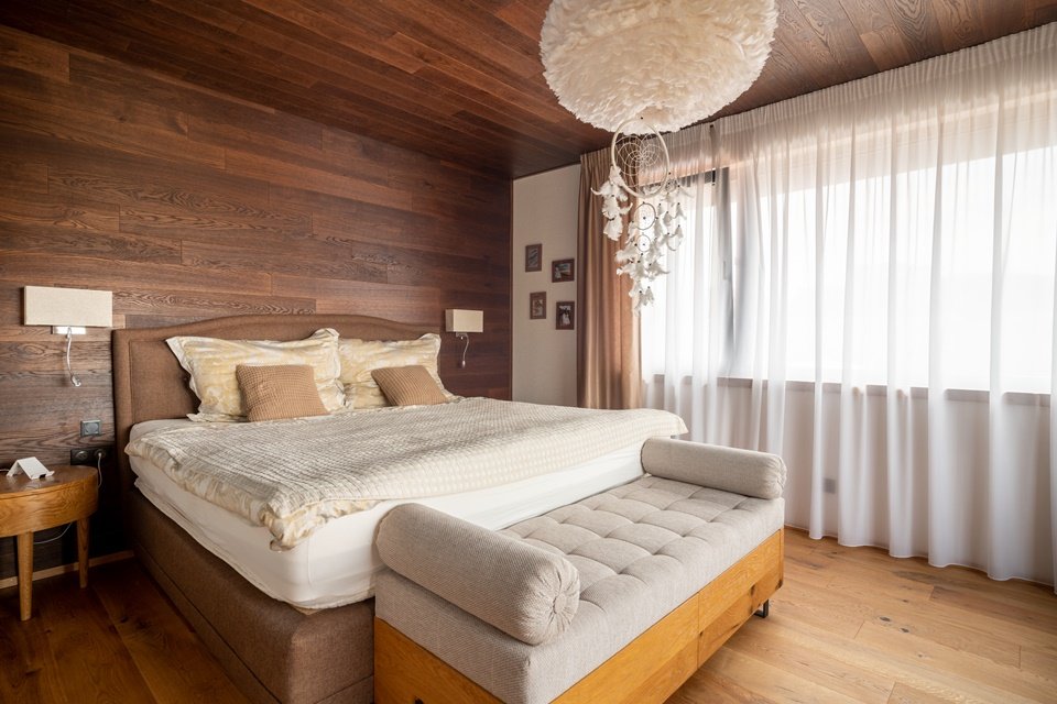 El interior de la vivienda de madera nunca se sobrecalentará gracias a las lamas de las persianas que proporcionan una protección solar adecuada. El techo oscuro ligeramente inclinado, por así decirlo, rodea todo el edificio y puede ayudar a oscurecer una gran parte de las áreas acristaladas. El borde oscuro tiene una capa de color especial proporcionada por la empresa STO que repele la luz solar, lo que ayuda a evitar el sobrecalentamiento de la vivienda. La calefacción y refrigeración de la casa está controlada por una bomba de calor en combinación con calefacción por suelo radiante.