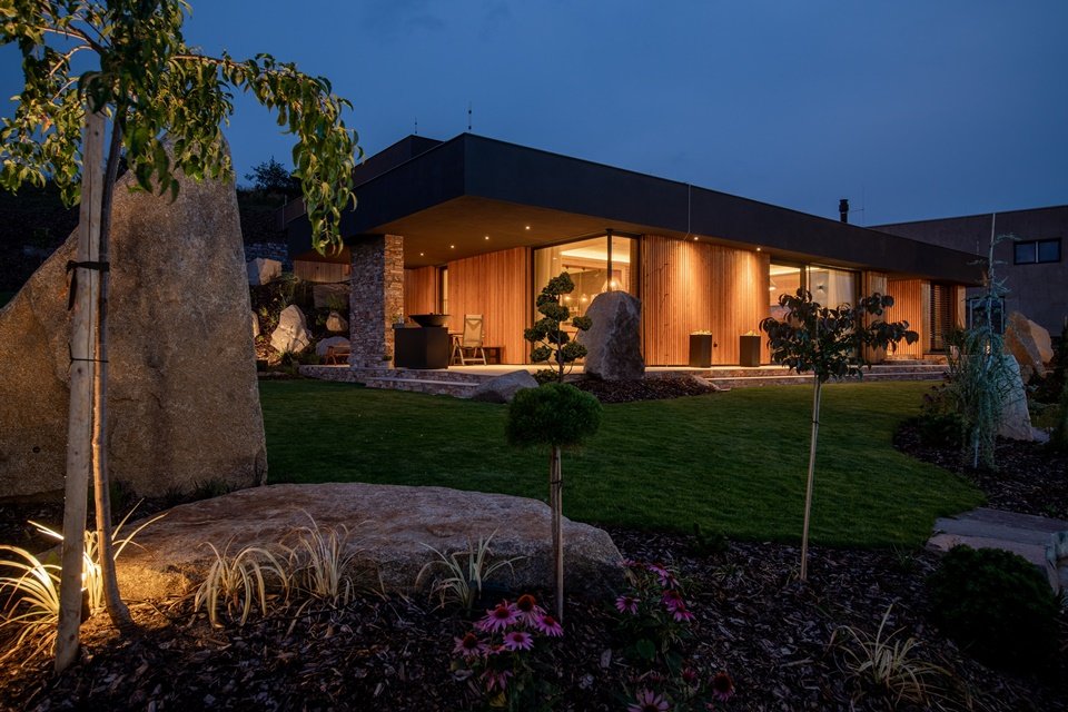 La casa es completamente ecológica y respetuosa con el medio ambiente y cumple con todos los estándares de una Passivhaus. Está controlada por la solución Loxone, que no solo asegura un control óptimo de la temperatura y la humedad, sino que también asegura una perfecta iluminación y riego de los campos circundantes. Todo esto de forma automática e inteligente.