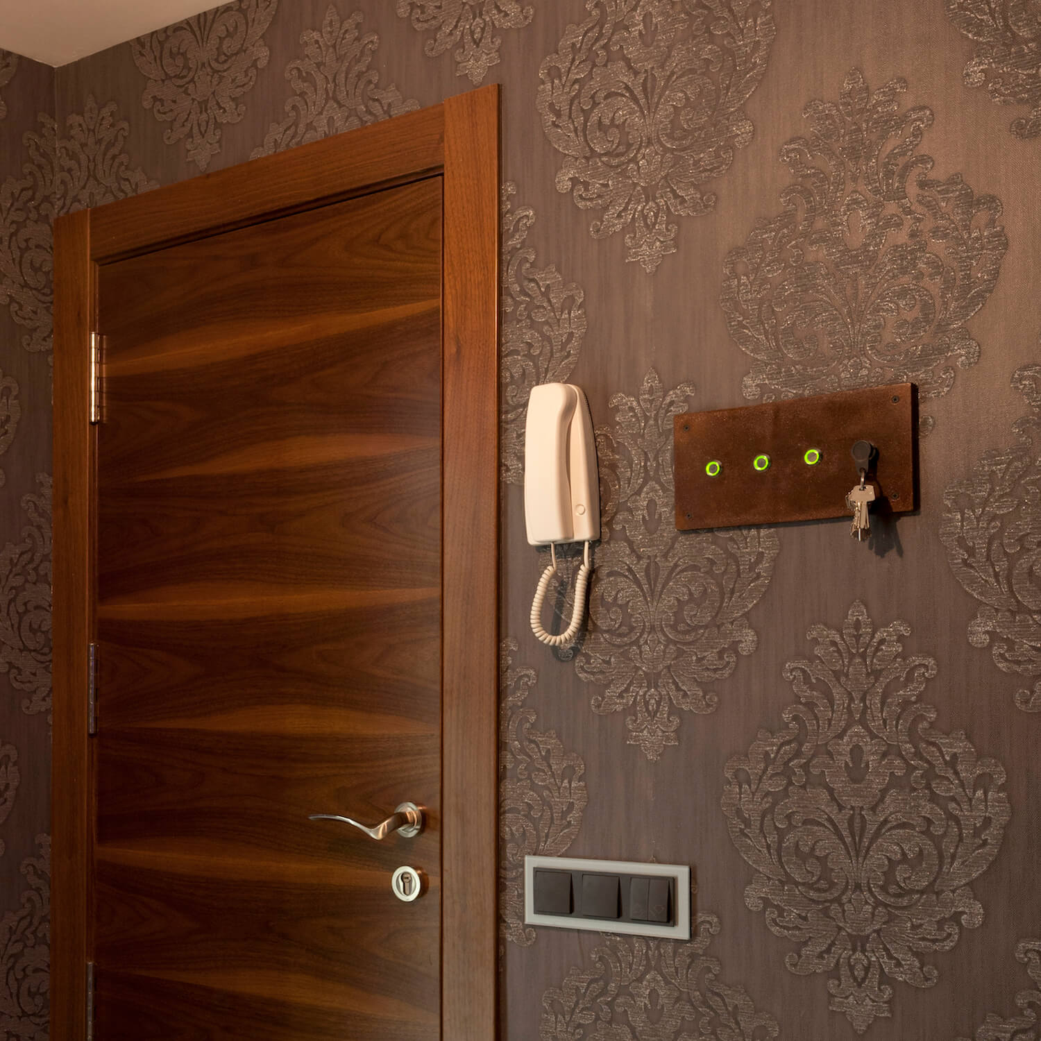Cada miembro de la familia tiene una llave electrónica y en la pared de la entrada se encuentran cuatro lectores que permiten reconocer cuando hay alguien en casa.