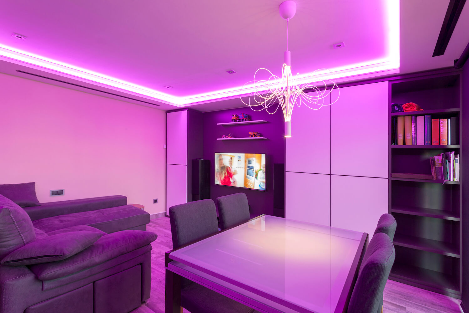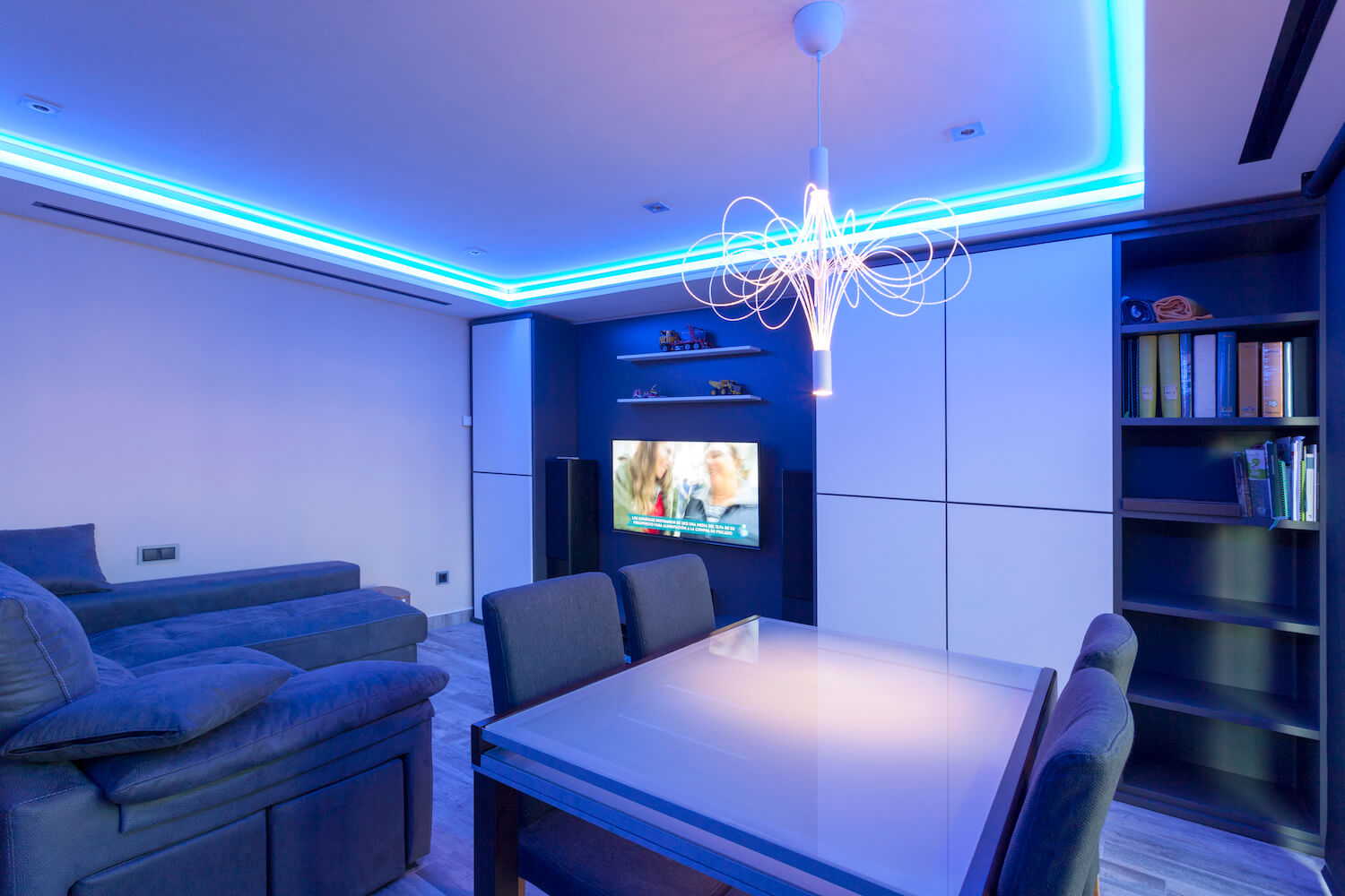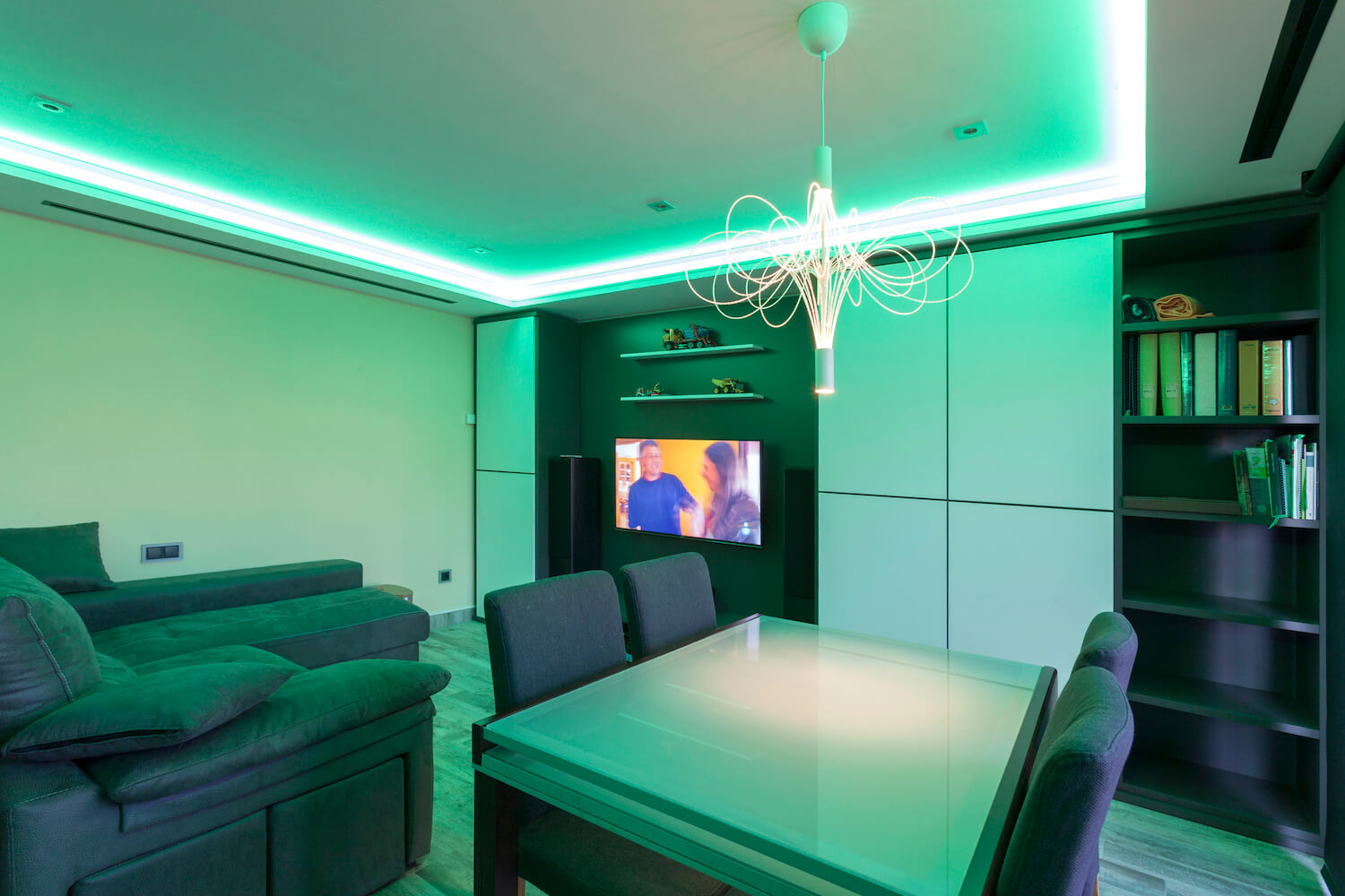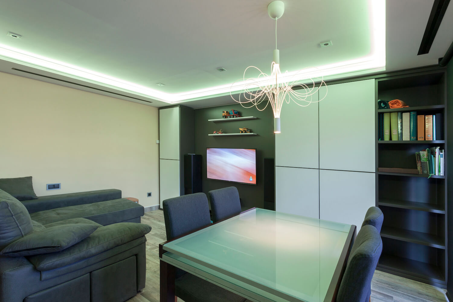 En la cocina-comedor, la iluminación toma un papel relevante, con muchisimas posibilidades de combinación. Las tiras LED RGBW instaladas en el techo permiten programar escenas de lo más extremadas.