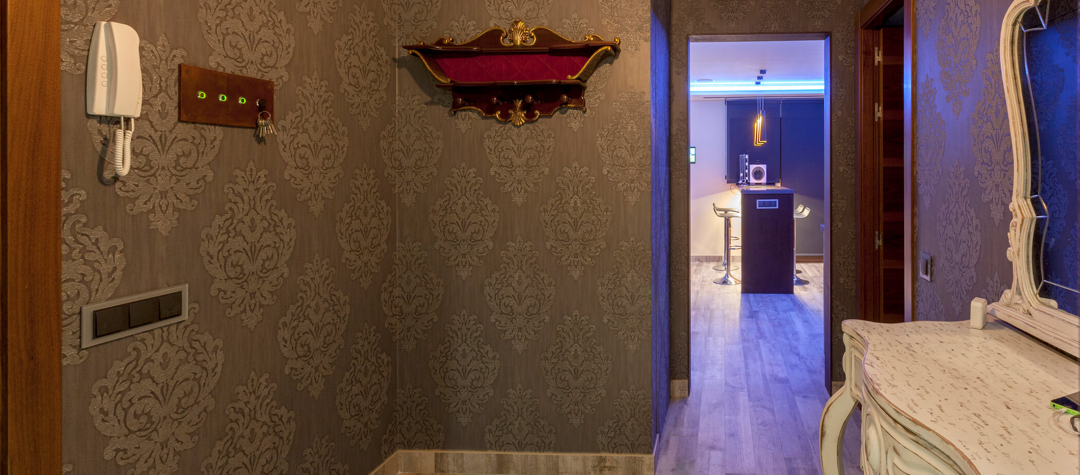 Al entrar en casa, se coloca la llave electrónica al lector y el recibidor te da la bienvenida con todo un espectáculo de contrastes. Interruptores de porcelana junto a sensores de movimiento. iPhones conviviendo junto a un antiguo teléfono e iluminación LED combinada con bombillas del “siglo pasado”.