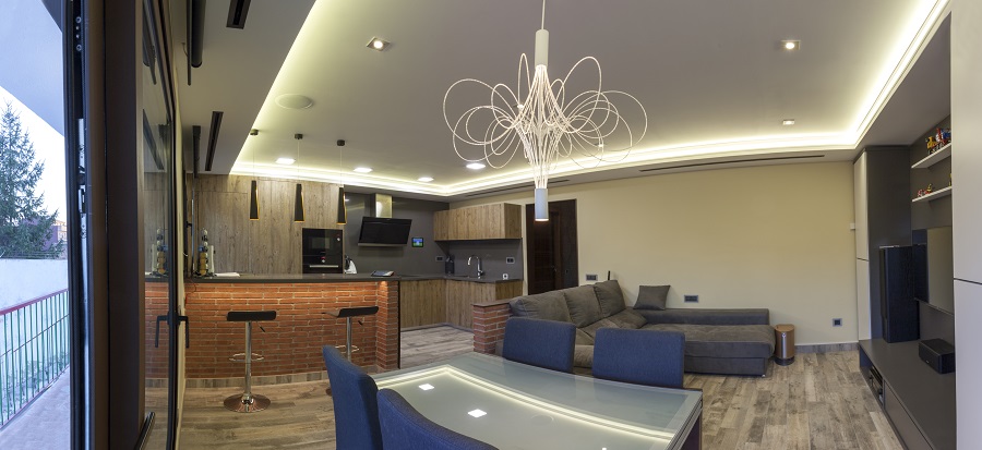 Desde el iPad o el Smartphone se pueden elegir las escenas de iluminación para cada momento, como la de Cocinar o Cenar. Además, una característica muy práctica para los usuarios es el pulsador que se encuentra justo al lado del sofá, pudiendo cambiar de escena de la forma más cómoda.