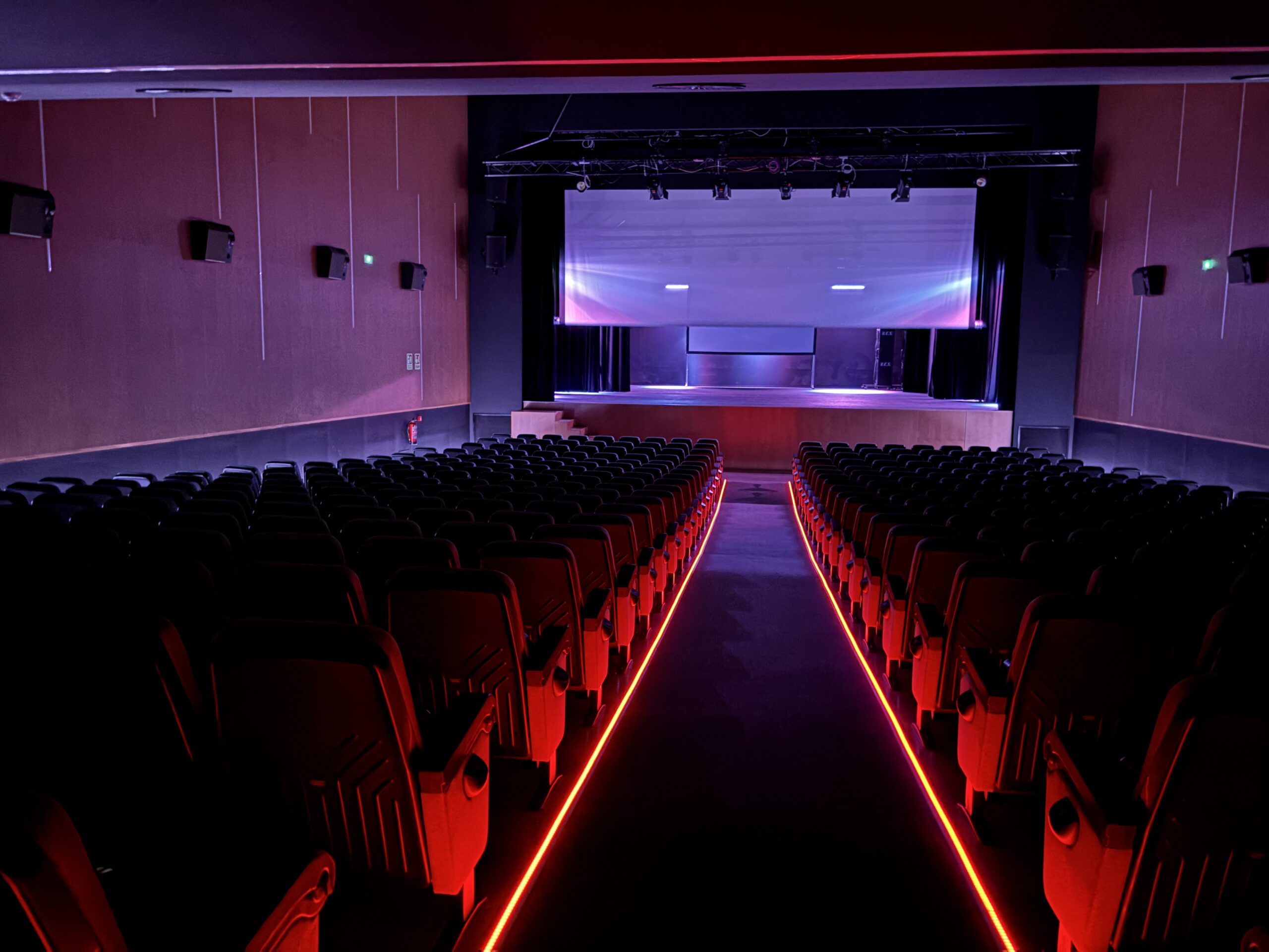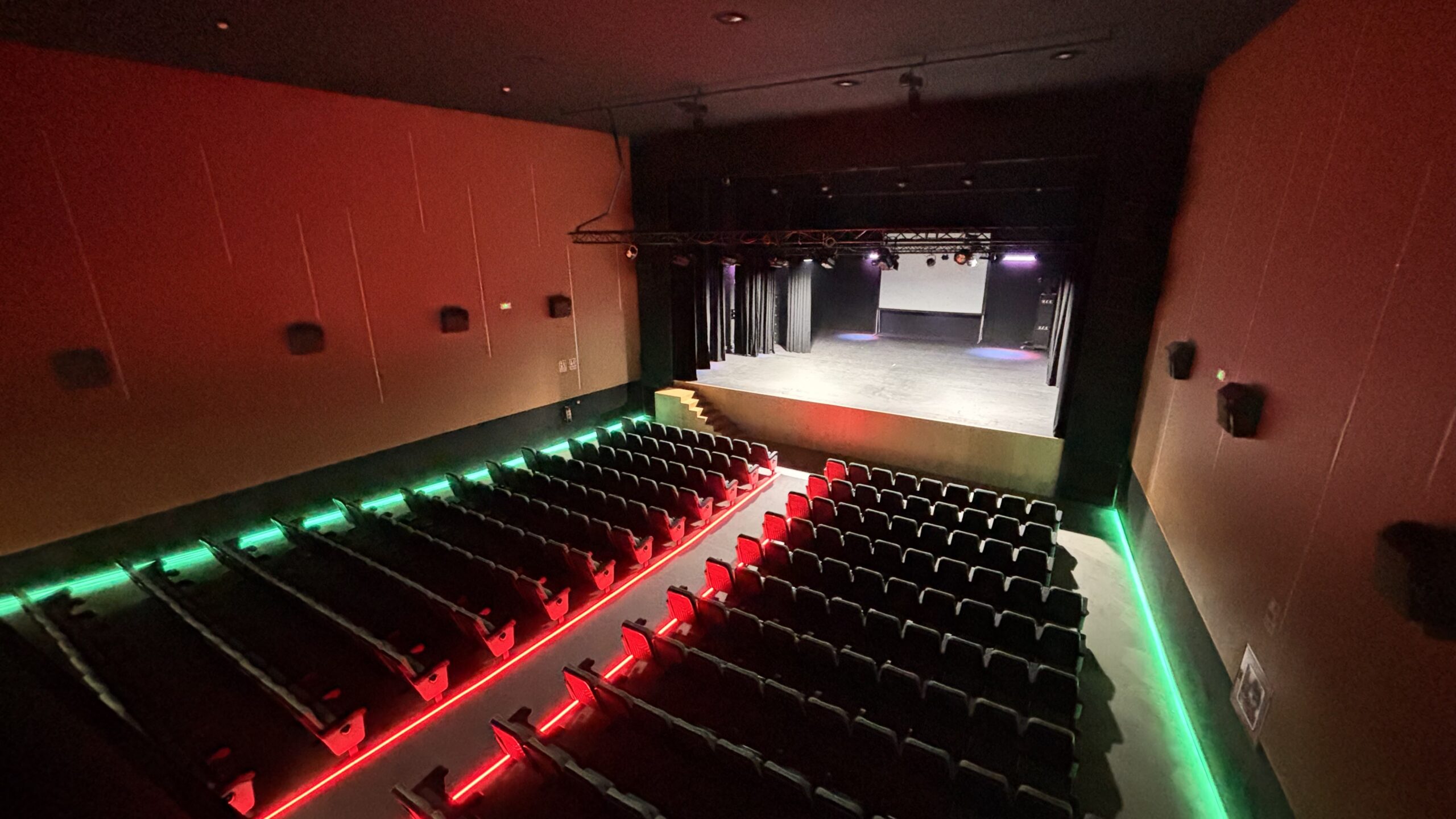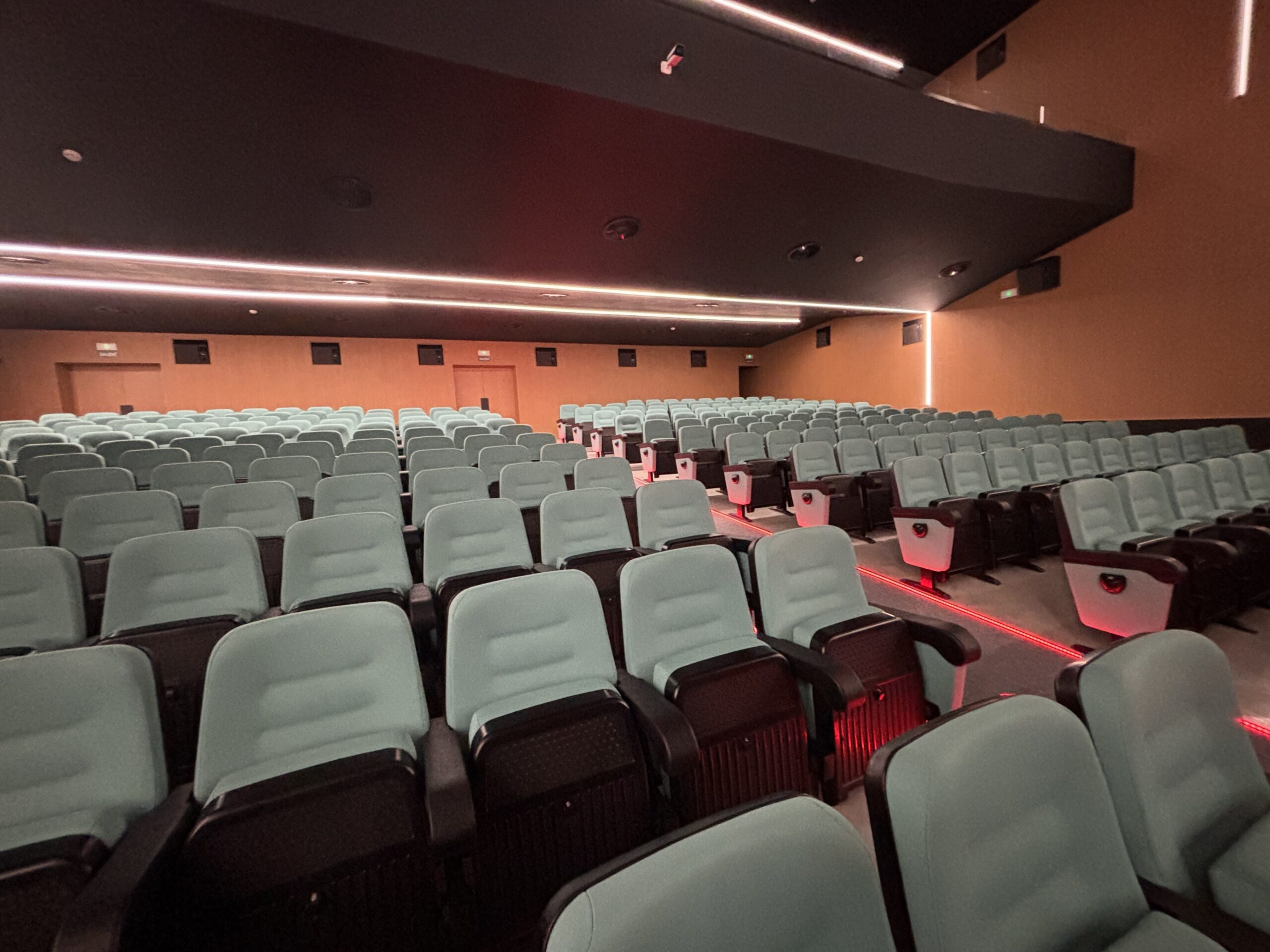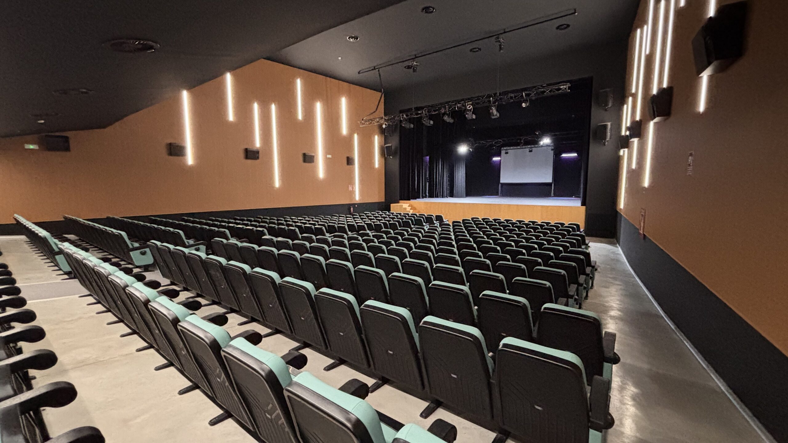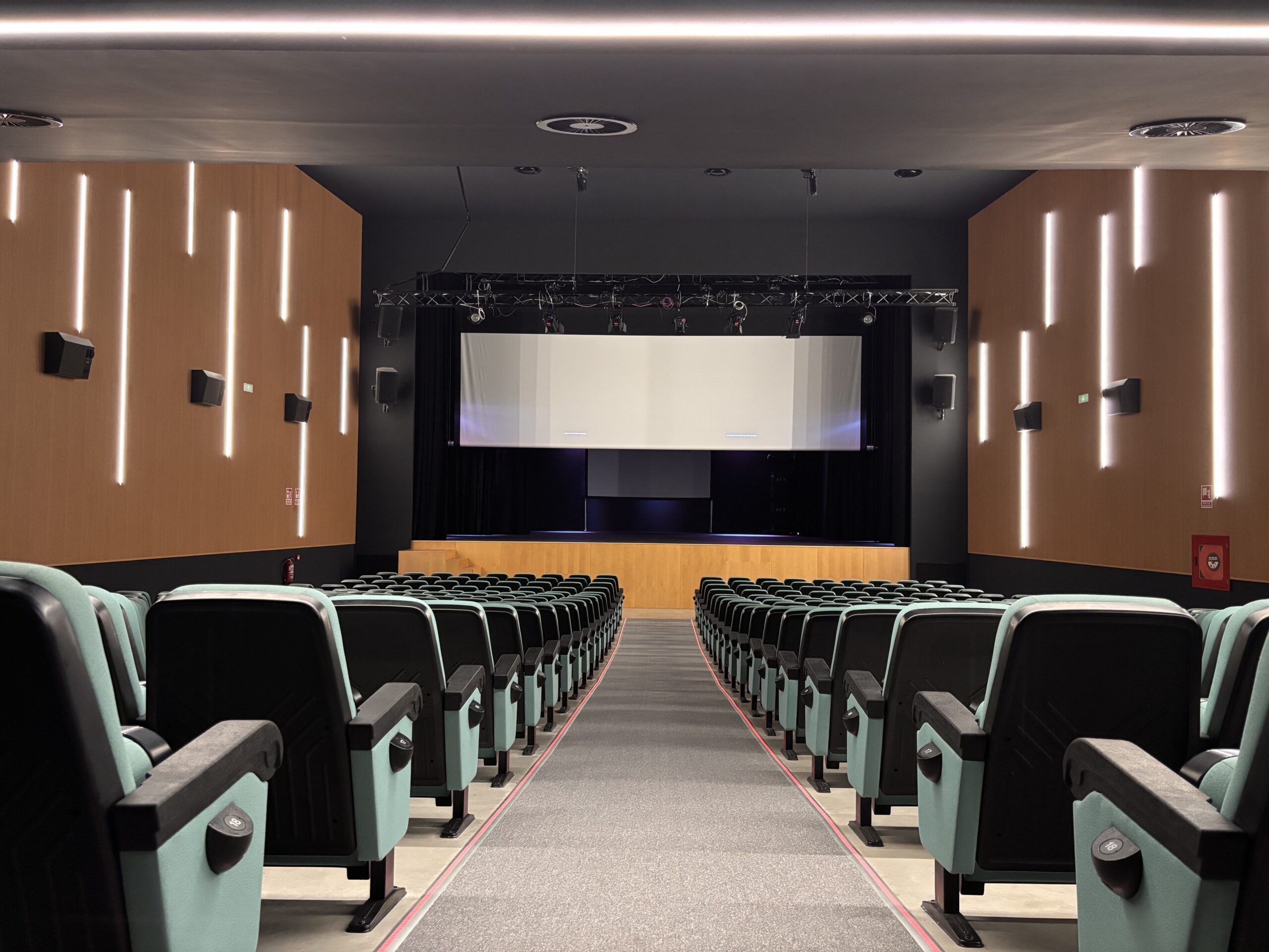La iluminación ha sido uno de los grandes ejes de este proyecto, ya que en un espacio cultural la atmósfera lo es todo. Se han creado diferentes ambientes de iluminación tanto en la sala principal, donde se proyectan películas y se representan obras de teatro, como en la zona de entrada y el hall, adaptándose a cada momento: antes de que empiece el espectáculo, durante la función y en la salida del público. Esto permite que cada experiencia tenga la ambientación perfecta.