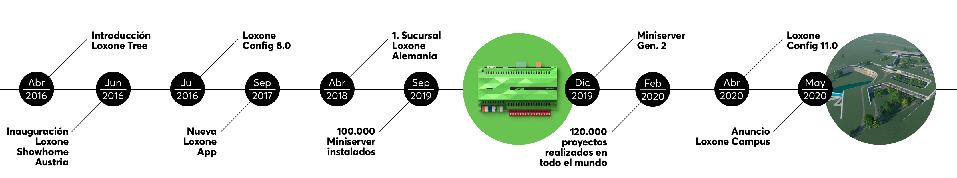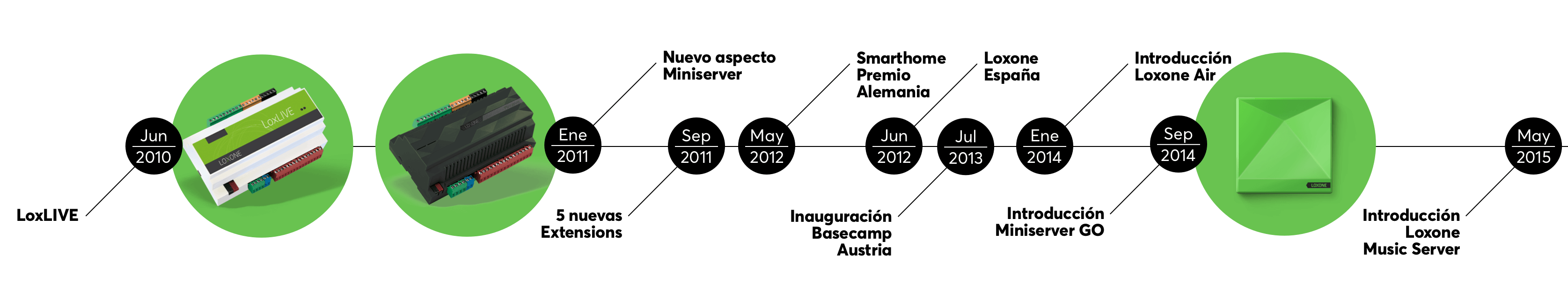 En 2011 cambiamos el nombre de algunos de nuestros productos que eran algo confusos. «LoxLIVE» se convirtió en el «Miniserver de Loxone», LoxMORE se convirtió en la Extension y LoxPLAN se convirtió en el Loxone Config. Además, se sustituyó la carcasa de color gris del Miniserver por una carcasa más elegante, especialmente diseñada y fabricada por inyección. La nueva carcasa era de color negro y no fue hasta el 2013, cuando el Miniserver de Loxone empezó a lucir la carcasa de color verde.