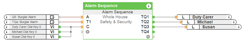 Con este nuevo módulo, se puede implementar una secuencia de alarmas en solo unos minutos, que notifica a hasta 10 participantes a través de una llamada, correo electrónico o una notificación push automática en caso de alarma. La principal característica del nuevo módulo es que también se pueden transferir variables de texto. Por ejemplo, se informa directamente a la persona asignada del sensor que ha causado la activación de la alarma.