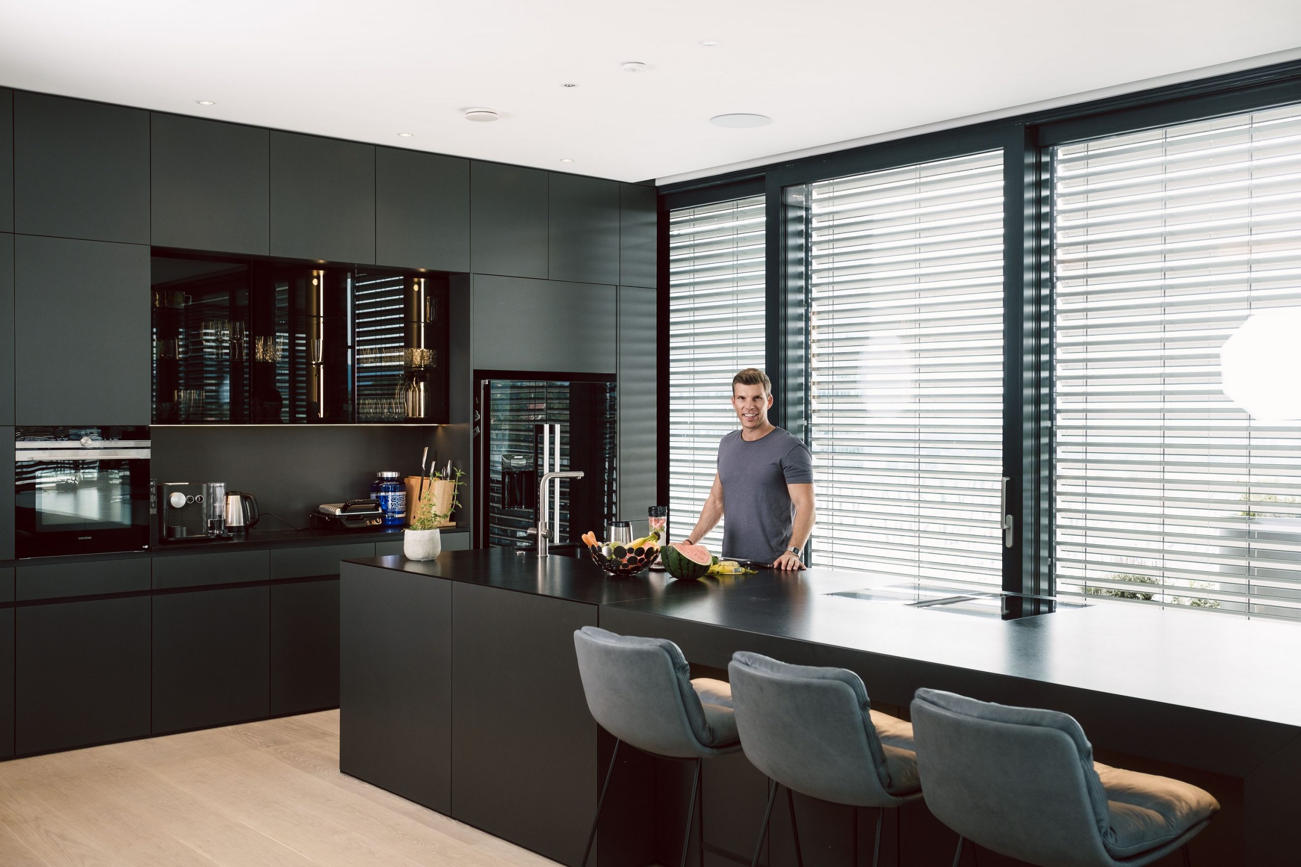 El hogar de Florian siempre sabe cómo actuar en cada momento. La iluminación se enciende automáticamente cuando es necesario, las persianas se regulan de forma independiente, garantizando el bienestar interior. Hay pulsadores Touch instalados, por si precisa de activar alguna función manualmente, pero gracias a la automatización, esto ocurre en pocas ocasiones.