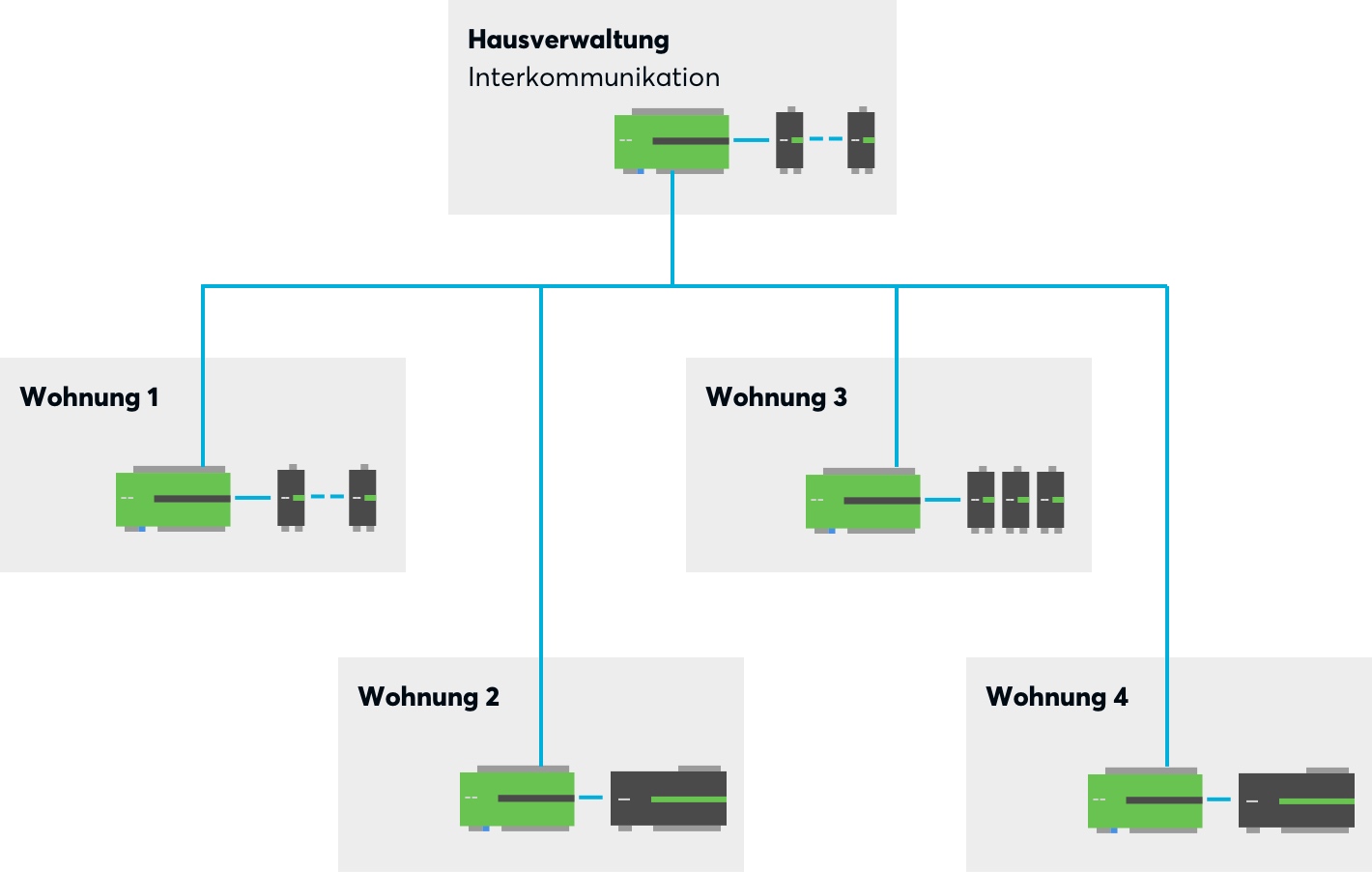 Dependiendo del tamaño del edificio, se pueden combinar varios Miniservers en red. Esto aumenta la capacidad y permite la automatización de proyectos extensos a gran escala.