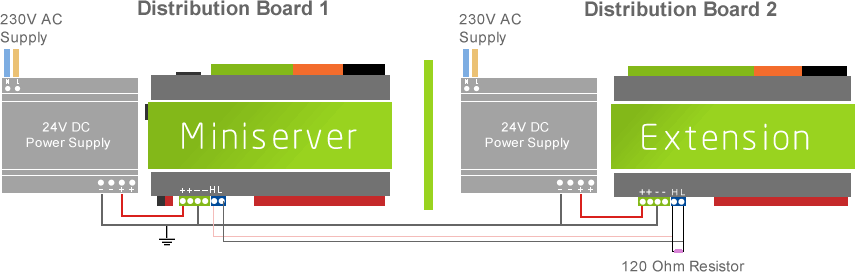 3. Conecte la resistencia de 120 ohmios, la cual se suministra en cada Miniserver, en la última Extension.