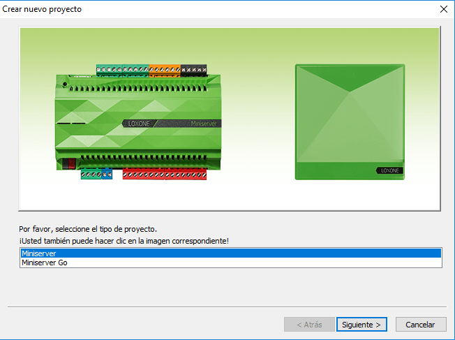 El primer paso del asistente nos permite seleccionar qué tipo de Miniserver vamos a usar en el proyecto. Recuerde que podemos seleccionar entre un Miniserver, pensado para ir instalado en cuadro eléctrico y con una serie de entradas y salidas incorporadas (puede obtener más información en el siguiente enlace), o un Miniserver Go, pensado para colocarlo cerca del router de la instalación y que incorpora la tecnología Loxone Air (en el siguiente enlace puede obtener más información).