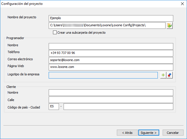 Una vez seleccionado el tipo de Miniserver pasaremos al segundo paso, donde podremos introducir los datos del proyecto (nombre y ubicación del archivo del proyecto), los datos del programador (nombre, teléfono, correo electrónico, página web y logotipo), y finalmente los datos del cliente final o usuario (nombre, calle, código del país y ciudad).