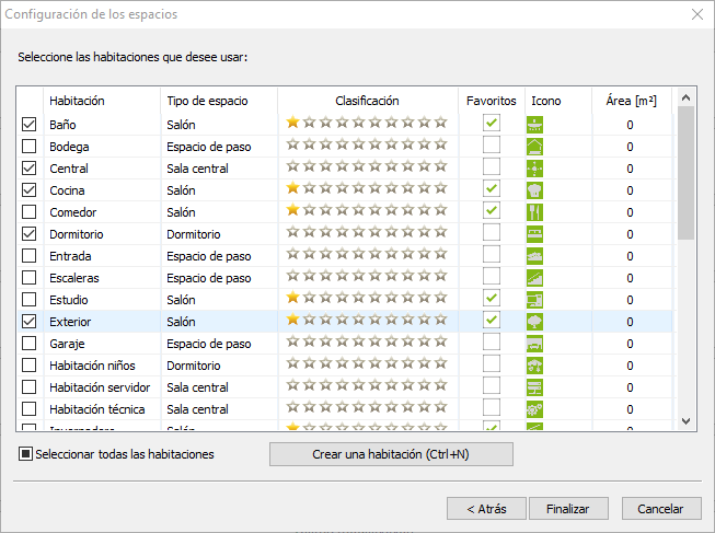 La última ventana del asistente nos permite definir los espacios o habitaciones de la que consta el proyecto. El asistente le propone todo un listado de habitaciones que puede seleccionar para incorporar en el proyecto, con una serie de propiedades, algunas predefinidas.