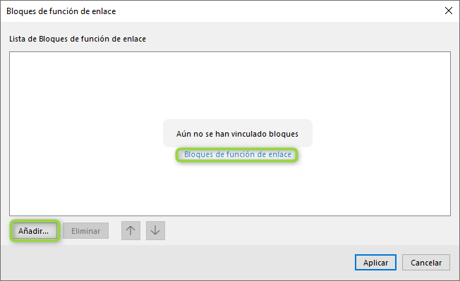 Todavía no hay bloques vinculados, por lo que hacemos clic en el botón Añadir: