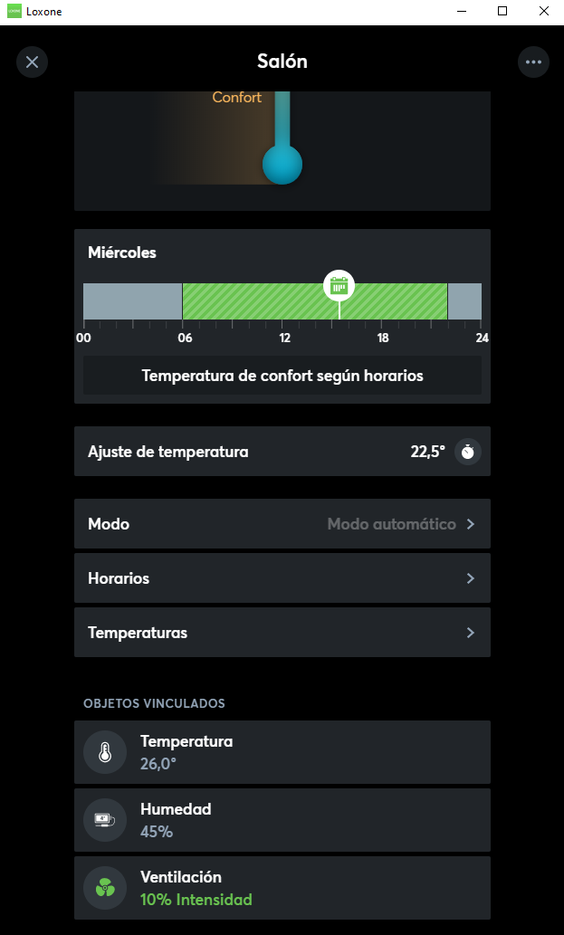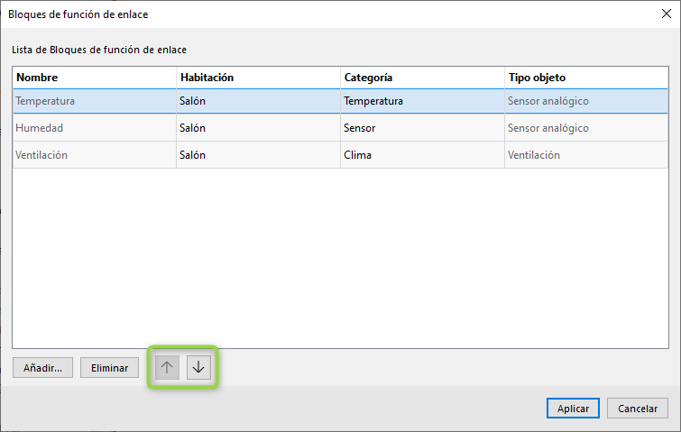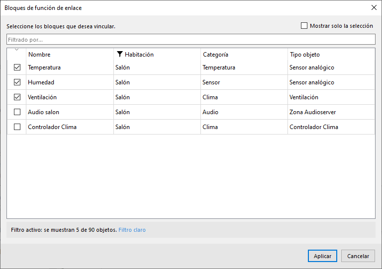 A continuación, seleccionamos la temperatura, la humedad, y el controlador de ventilación de la habitación salón, y hacemos clic en Aplicar: