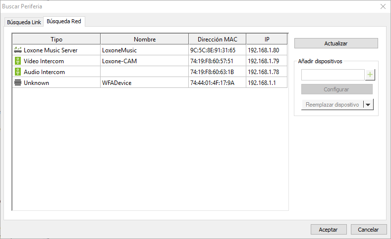 A la parte derecha de la ventana Buscar Periferia, en la pestaña Búsqueda Red tiene una serie de botones para Actualizar la búsqueda de los dispositivos de red y añadir nuevos dispositivos.