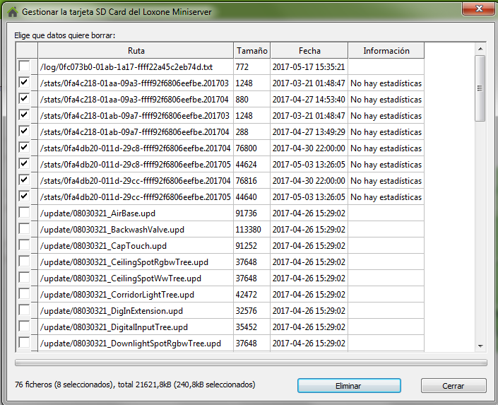 El Miniserver gestiona automáticamente la capacidad de la tarjeta SD de forma automática, separando en carpetas y archivos distintos los diferentes datos que le son necesarios. La tarjeta puede ir llenándose de datos antiguos, que ocupan espacio innecesario. Estos datos antiguos, puede eliminarlos desde el Loxone Config mediante el botón Gestionar Tarjeta SD.