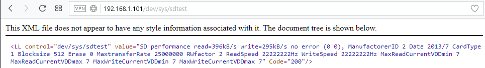 1. Abrir un navegador compatible y poner el siguiente comando en la dirección del navegador: «http://<ip.miniserver>/dev/sys/sdtest» donde <ip.miniserver> es la dirección IP del Miniserver (dirección IP local o dirección remota).