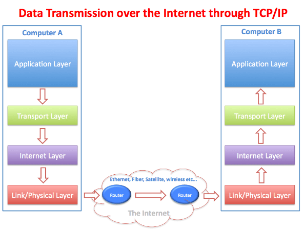 - Capa de transporte: Capa encargada de efectuar el transporte de los datos (que se encuentran dentro del paquete) de la máquina origen a la de destino, independizándolo del tipo de red física que esté utilizando.