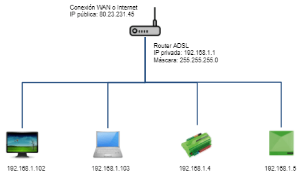 El router gestiona también una red privada, y el propio router tiene asignada una dirección IP. En el ejemplo, la 192.168.1.1 y con la máscara 255.255.255.0. El mismo router gestiona por DHCP la conexión de los equipos a esta red privada.