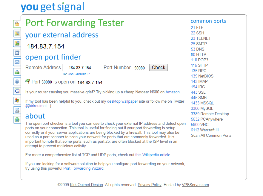 Si el puerto externo está correctamente abierto, la página web le devolverá el mensaje Port xxxx is open on xxx.xxx.xxx.xx. Si no es así, consulte en el siguiente enlace para intentar averiguar dónde puede estar el problema.