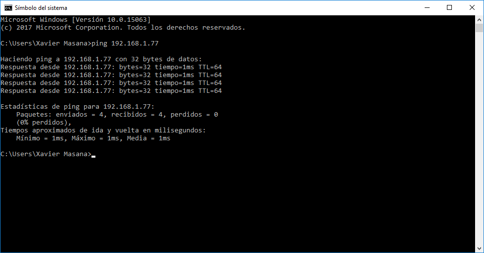 2. Una vez abierta la ventana de la línea de comandos teclee el comando ping “dirección IP equipo”, siendo “dirección IP equipo” la dirección IP del equipo con el formato adecuado. Por ejemplo: ping 192.168.1.77