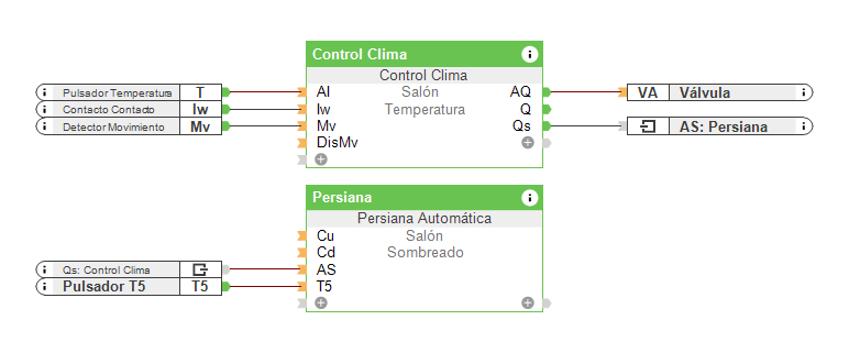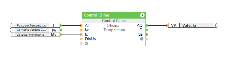 Asimismo, es importante no tener más de un bloque de función Control de Clima en una misma habitación o estancia, aunque tenga más de un sistema de calefacción. Imagine que en un aseo tiene suelo radiante para calefacción y un toallero. Si decide poner dos bloques de función Control Clima crearían conflicto entre ellos, por lo que deberíamos poner solo un bloque de función Control Clima para controlar el suelo radiante y un temporizador para el toallero, por ejemplo.