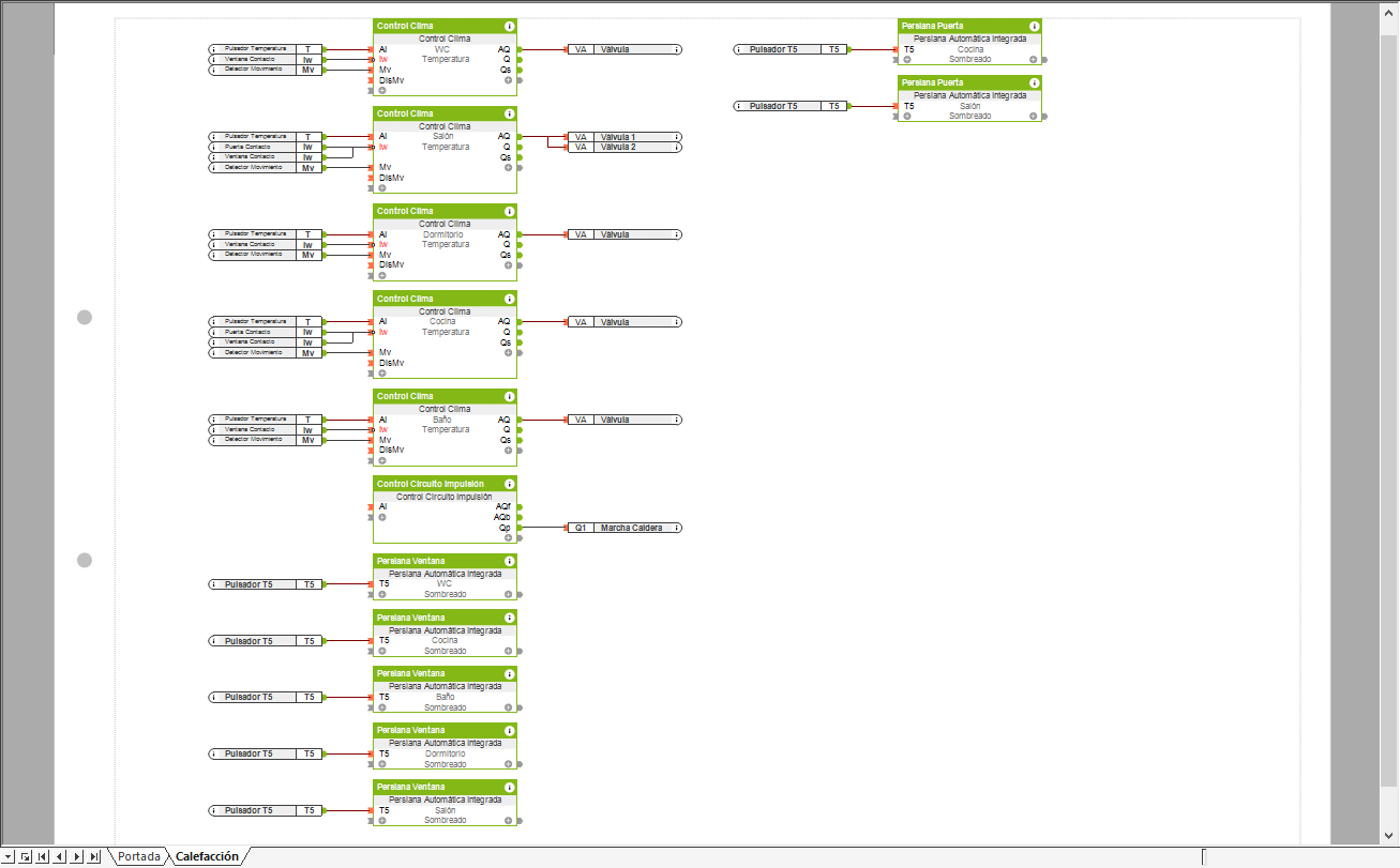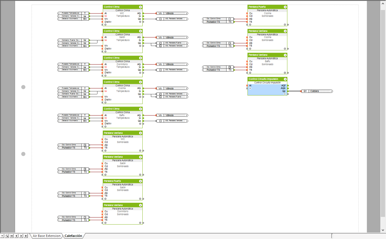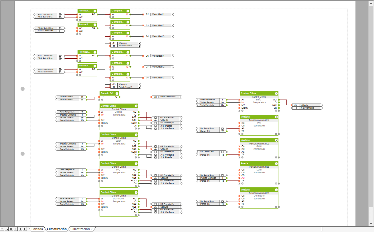 En la programación tenemos una página con los bloques de función Control de Clima que controla la temperatura de cada habitación, y un bloque de función Control Circuito Impulsión.