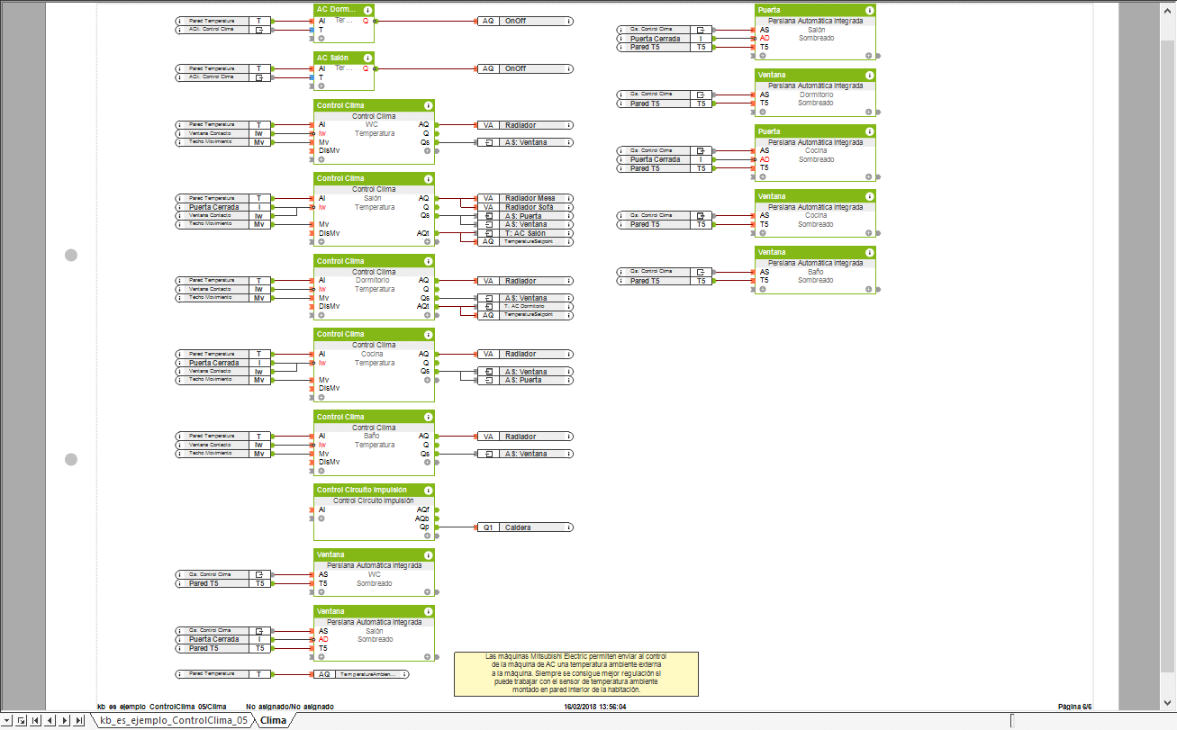 Una de las particularidades de este sistema de climatización (que podemos encontrar en otros), es que el sistema de producción solo es capaz de producir calor o frío, por lo que todos los bloques de función Control de Clima deben estar trabajando en el mismo Modo.