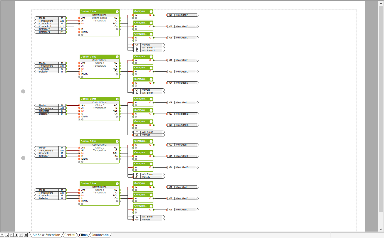 Muchas instalaciones de clima disponen de fan-coils de 3 velocidades para obtener calefacción y refrigeración. Este tipo de instalaciones son más dadas en oficinas y habitaciones de hotel, por lo que el ejemplo que hemos realizado se basa en una planta de oficinas.