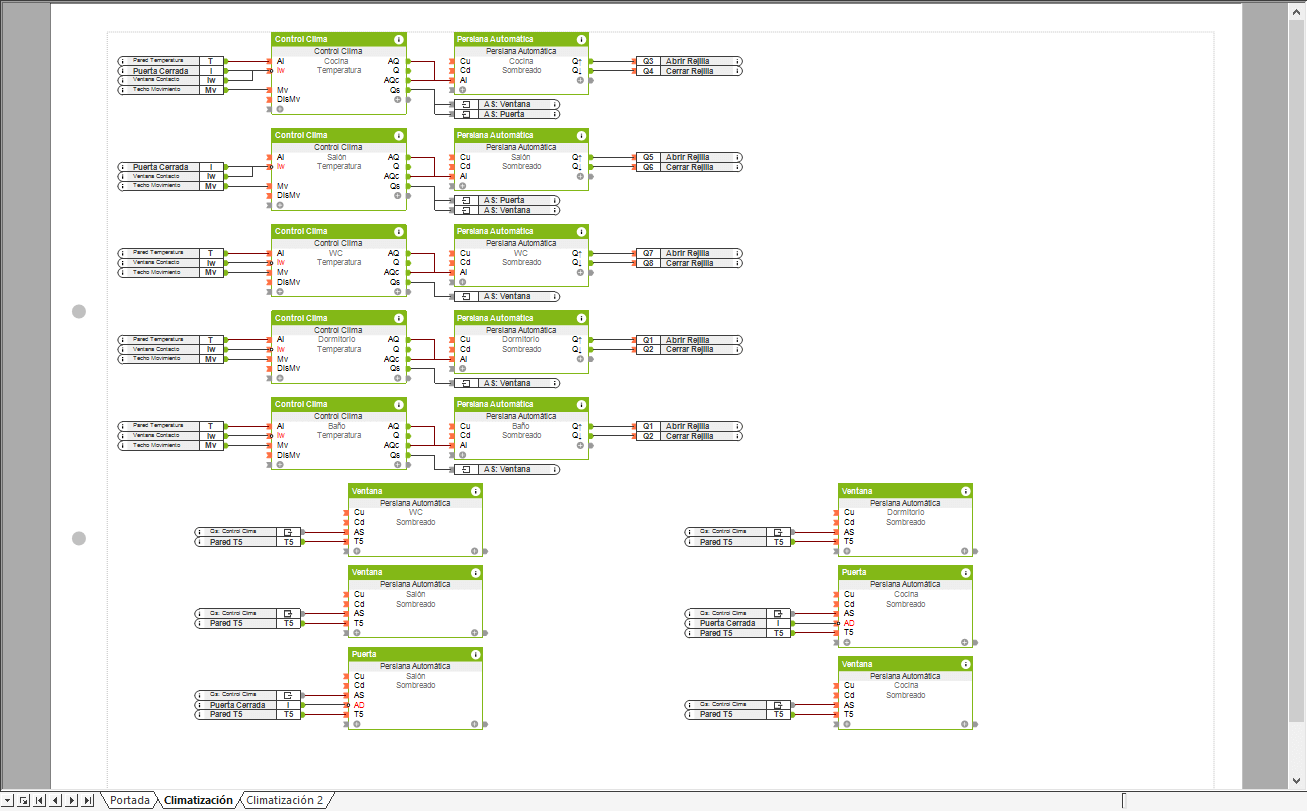 A más, se han añadido bloques de función de Persiana Automática para cada habitación para que se vea como se realiza la conexión entre el sistema de clima y las persianas de la habitación. Aunque no tenga sistema de refrigeración, no desactive ésta, porqué de esta forma el Control de Clima podrá ejercer control sobre el sistema de sombreado de la habitación. También se ha añadido una estación meteorológica junto con un servicio meteorológico para usar el control solar en el Control de Clima.