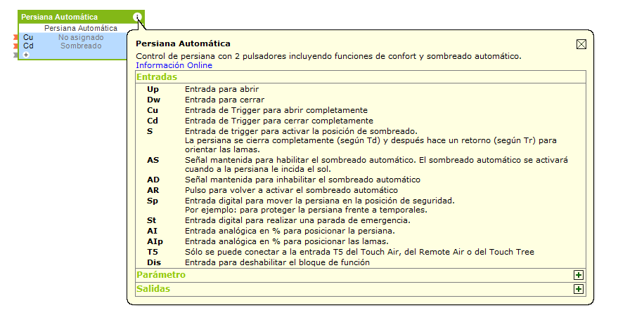 Dispone de una amplia ayuda en los bloques de funciones de nuestro software de configuración. Para entrar en la ventana de ayuda debe desplazarse encima de la «i» arriba a la derecha del bloque de función (después de arrastar el bloque a una página de programación).