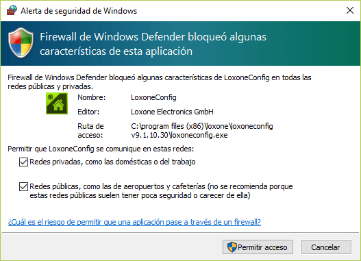 Con esta acción está dando permisos al Loxone Config para trabajar y comunicar con los Miniserver sin problemas, sea cual sea el tipo de red que tenga en ese momento.