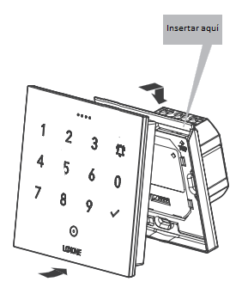 El NFC Code Touch también se puede instalar en la pared deseada utilizando el marco adjunto. Para garantizar una instalación firme, el marco de montaje debe estar plano en la pared. El NFC Code Touch se cuelga desde arriba en el marco y se encaja firmemente en la parte inferior del «snapper». Para liberar el dispositivo, tire con fuerza del lado inferior para liberarlo del pargo.