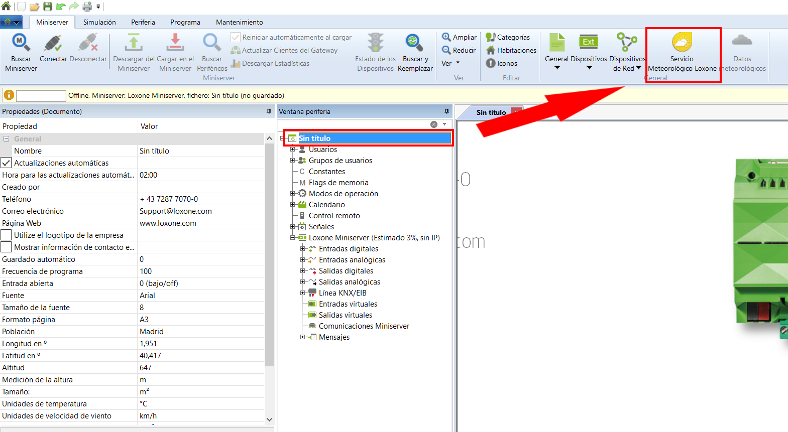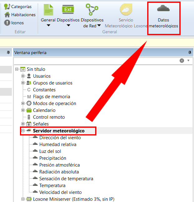 Seleccione en el árbol de periferia el título del documento. En el menú superior pulse el botón de «Servicio Meteorológico Loxone» y el servicio aparecerá en el árbol de periferia.