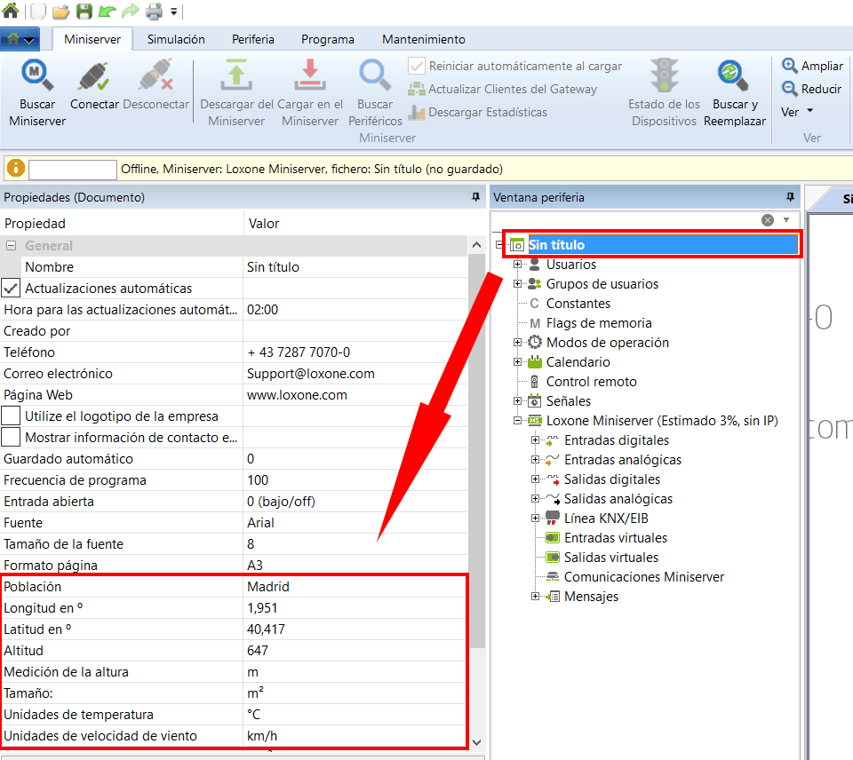 Para que los datos meteorológicos mostrados sean correctos, tiene que especificar en las propiedades del documento su lugar de residencia. Si tiene conexión a internet, las coordenadas se calcularán de forma automática.