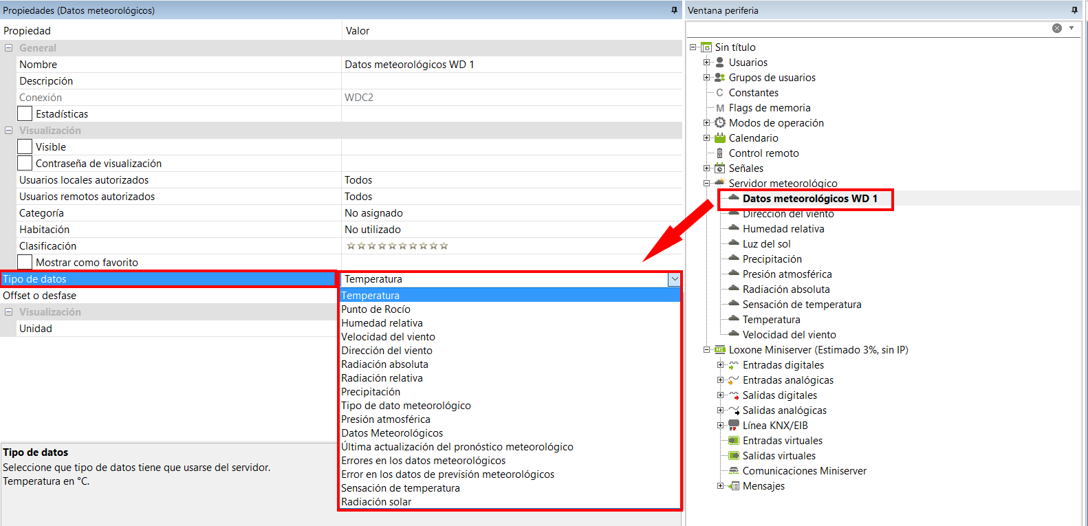 En las propiedades del nuevo dato meteorológico, puede seleccionar el dato meteorológico deseado.