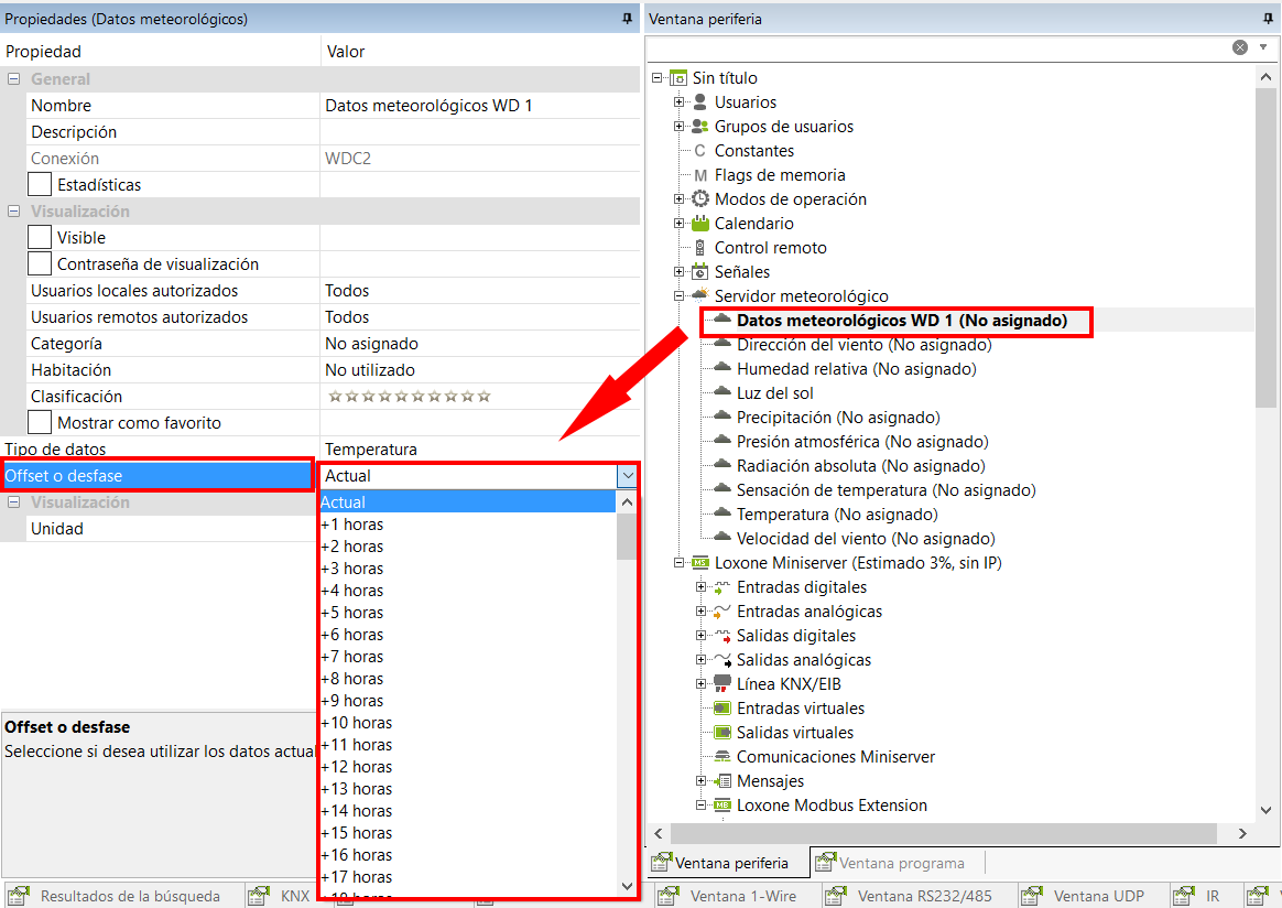 También puede elegir el desfase de este dato, es decir o puede seleccionar que el dato sea actual o de una previsión. Por ejemplo, puede seleccionar la temperatura dentro de 2 horas.