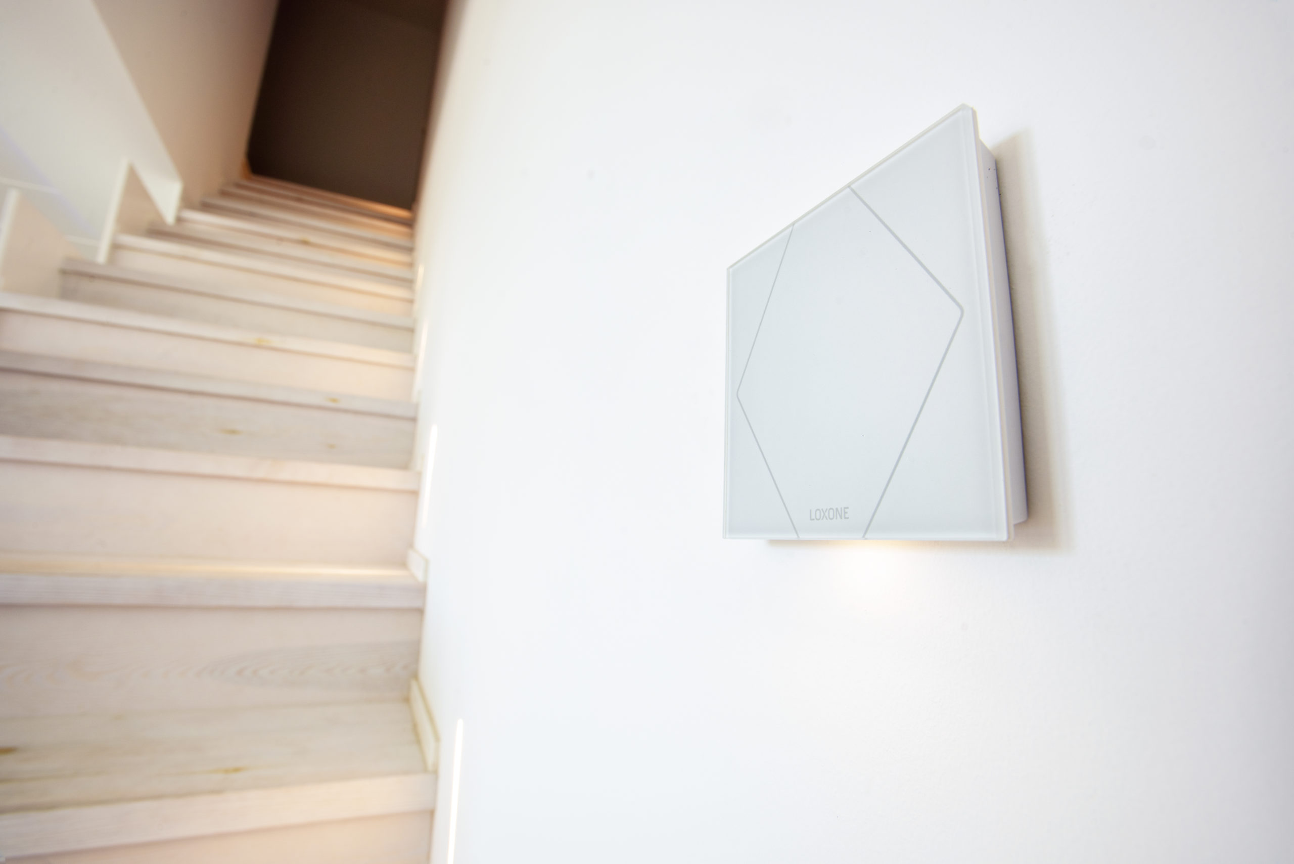 En las escaleras que suben al segundo piso hay instalado el pulsador Touch Pure, un pulsador de diseño, sin marco y con superficie de vidrio satinado de alta calidad. Se muestran las características y concepto de pulsadores de Loxone. Este además lleva incorporado un sensor de temperatura y humedad y dispone de una luz de baliza.