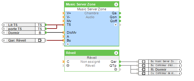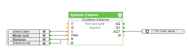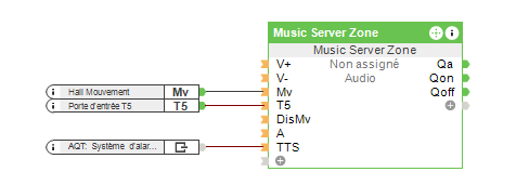 Une autre caractéristique fantastique du Loxone Music Server est qu’il peut lire des messages d’alerte personnalisés sur les haut-parleurs multi-room grâce à la fonction Text-to-Speech. Par exemple, on peut rappeler à vos clients qu’une fenêtre est encore ouverte alors que la nuit tombe, ou si la porte du garage est toujours ouverte après le crépuscule. Pour ce faire, connectez la sortie texte AQt du bloc fonctio alarme à l’entrée de synthèse vocale (TTS) du Music Server Zone à l’aide d’un memory flag.