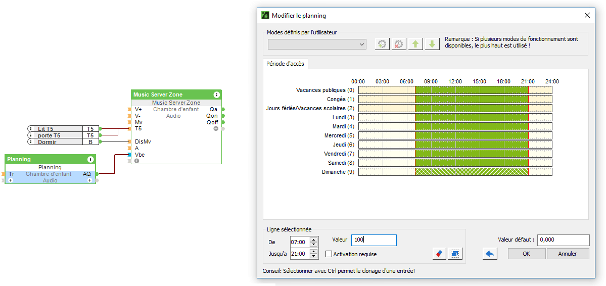 Pour ce faire, connectez la sortie du bloc fonctionnel Schedule à Vbe – qui est le paramètre de volume sonnette. Maintenant que vous l’avez configuré, vous pouvez double-cliquer sur l’horaire ou utiliser l’application Loxone Smart Home pour définir quand la sonnette peut être entendue et à quel volume.