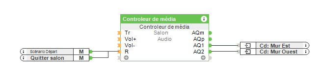 En double-cliquant sur le bloc fonction, vous pouvez créer différents modes et définir une séquence d’événements pour chaque bouton ou entrée sur le contrôleur de support. Les sorties d’objets peuvent également être incluses dans cette séquence d’événements. Dans cet exemple, les sorties AQ1 et AQ2 sont chargées de baisser les stores et l’écran du projecteur. Le projecteur est ensuite activé avec une commande réseau.