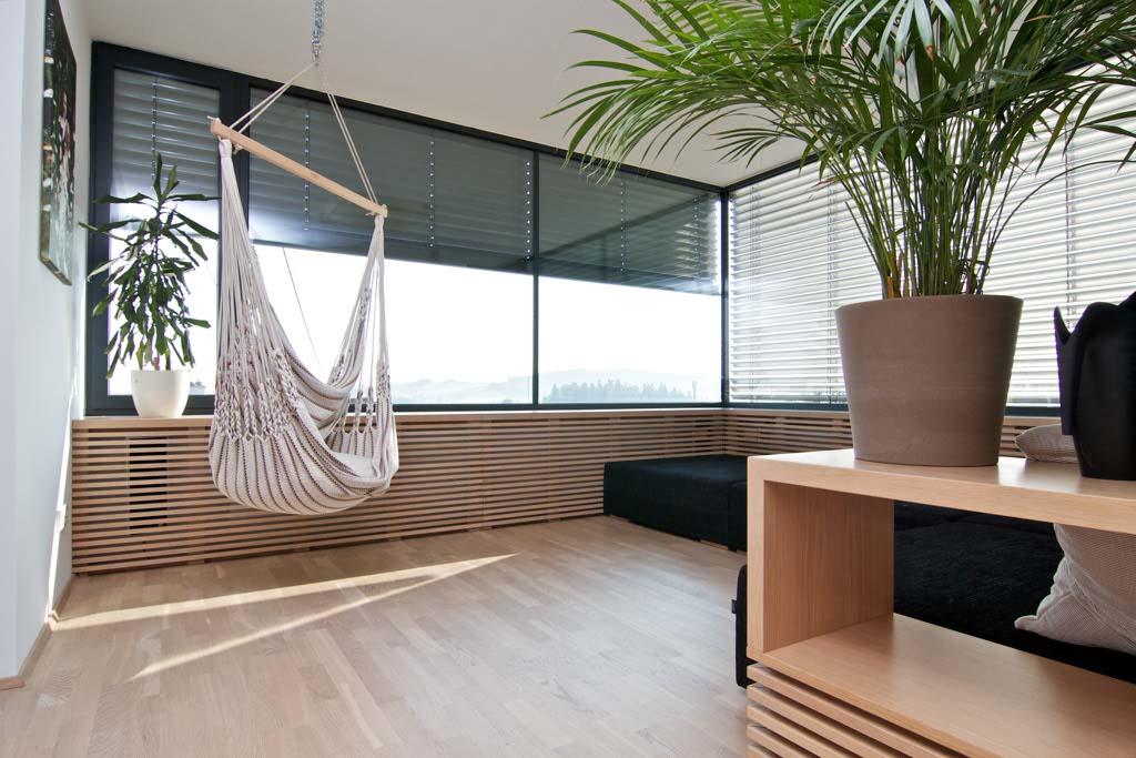Le matin les rayons du soleil sont parfaitement capturés et chauffent les chambres. Le midi, en fonction de la température et de la lumière, les stores se referment et enfin la nuit, les stores se ferment complètement et automatiquement pour économiser l’énergie. Bien sûr, nous pouvons aussi règler nos stores via bouton-poussoir ou iPhone à tout moment. Mais parfois, ils fonctionnent pendant des jours sans aucune intervention manuelle.