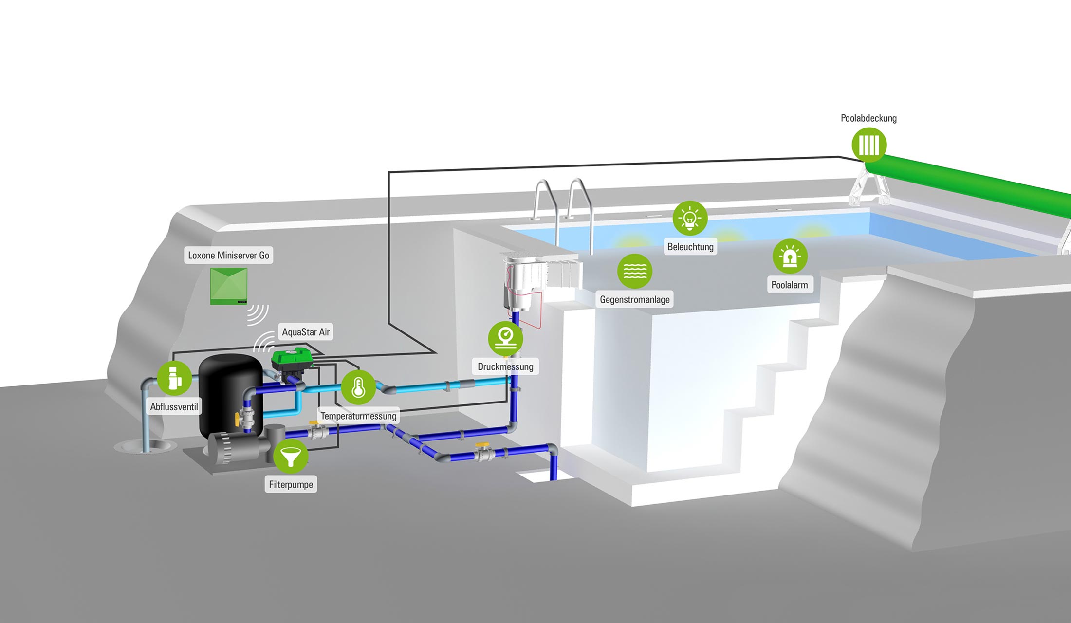 Chaque propriétaire d’une maison Loxone, qui utilise déjà notre technologie, a la possibilité via l’AquaStar Air d’améliorer sa piscine et de la transformer en « Smart Pool ». Et sans travaux majeurs de plomberie. Dans la plupart des cas, une vanne à contre-courant de PRAHER peut être installée sur le filtre manuel déjà existant sans avoir à le démonter. Le reste est géré par l’intelligence de Loxone et sa technologie Air.