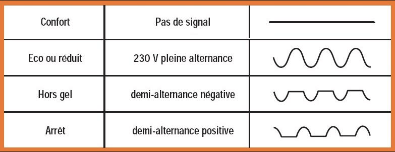 Il est possible d’envoyer 6 signaux différents à travers le fil pilote correspondant à 6 ordres différents :