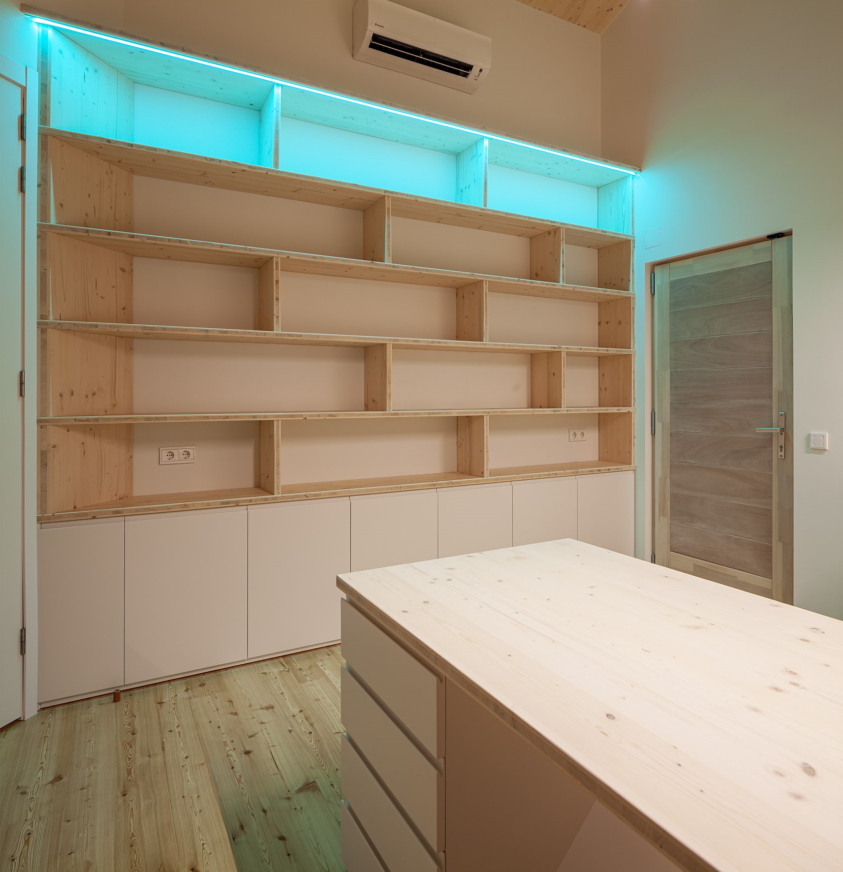 - Éclairage intérieur et extérieur automatisé. À l’intérieur, il suit le cycle circadien et est activé et régulé en fonction de la présence, tout en étant contrôlé par les environnements lumineux, ce qui évite d’avoir à allumer l’éclairage à sa puissance maximale. À l’extérieur, en fonction de la luminosité et de l’heure de la journée. De plus, lorsque les fenêtres sont ouvertes la nuit, l’éclairage intérieur passe aux tons rouges pour empêcher les insectes d’entrer.