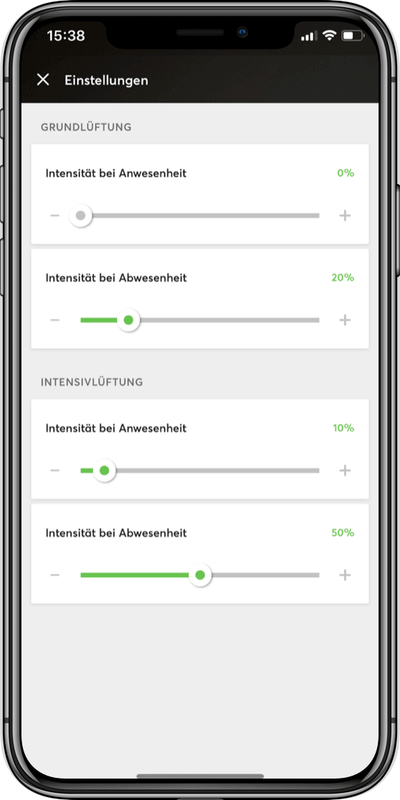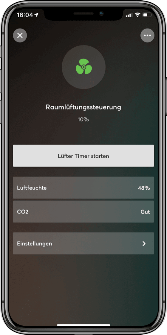 Vos clients ont toujours un aperçu de l’état de fonctionnement actuel de la ventilation de leurs pièces. En plus de la vitesse actuelle de ventilation, si la technologie de capteur est disponible, l’humidité relative et la teneur en CO2 sont affichées.
