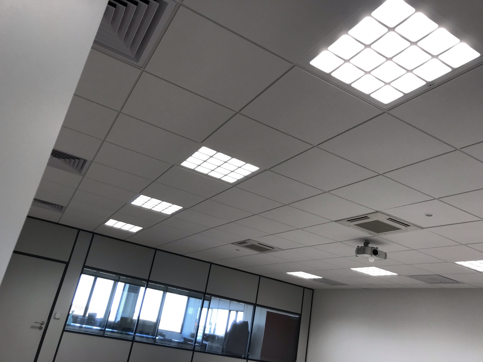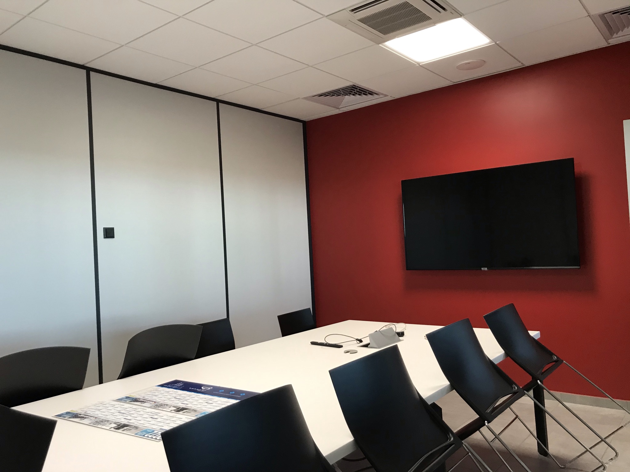 Dans les salles de réunion, L’éclairage est automatique, cependant un interrupteur comportant quatre boutons préprogrammés a été installé pour permettre de faire varier les ambiances. Par exemple, pour la projection sur grand écran d’une présentation, la lumière baisse à l’avant de la salle. Également, dans ces salles de réunion, des sondes de CO2 régulent le taux de CO2 via la CTA