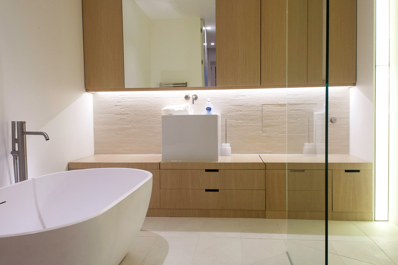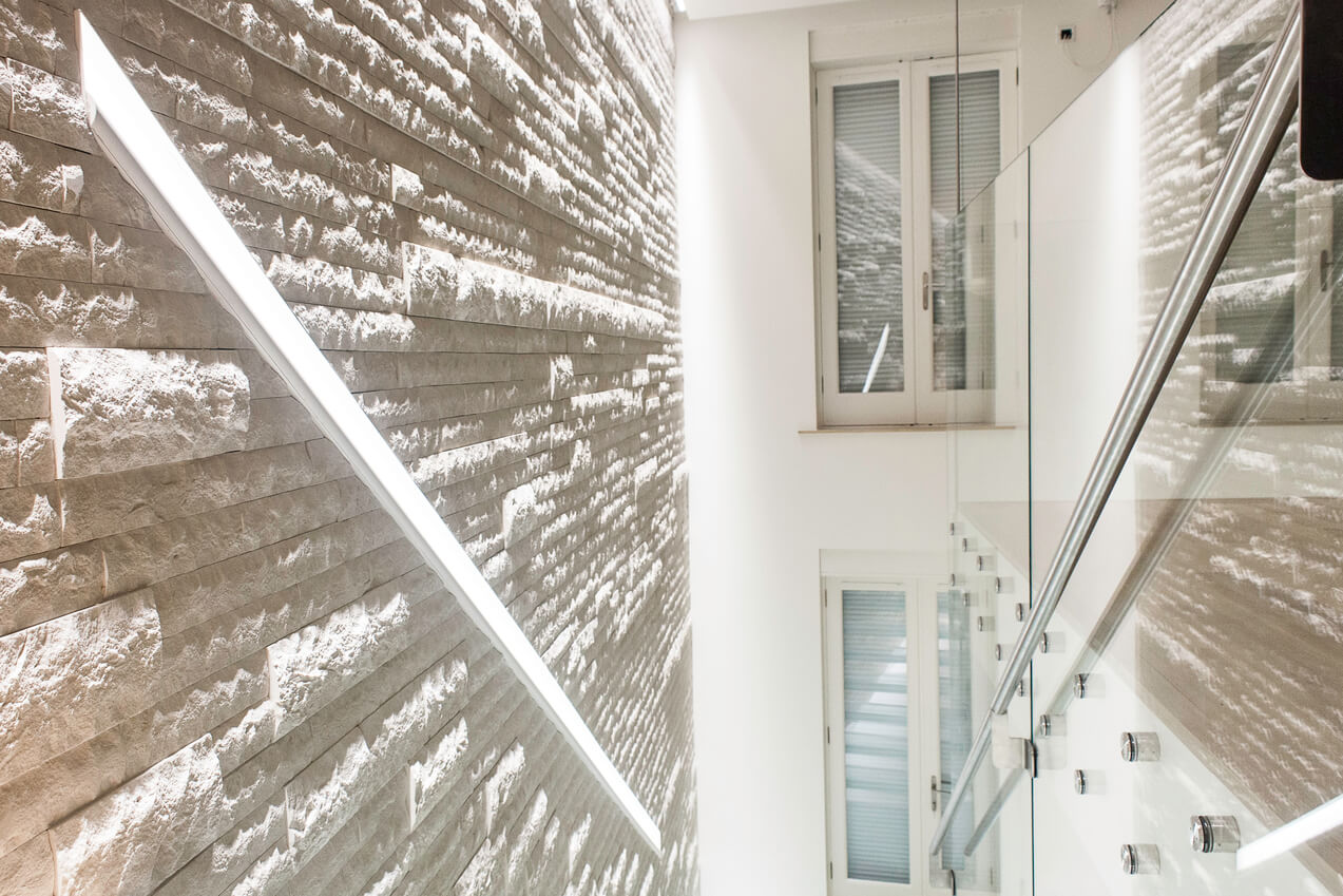 Un si bel intérieur mérite le meilleur éclairage, et grâce à un design et une gestion intelligente, les propriétaires peuvent vraiment impressionner leurs invités en mettant en évidence les différentes caractéristiques de leur maison – qu’il s’agisse des lignes élégantes et propres de la cuisine, l‘escalier en verre incroyable, ou bien encore le mur en pierre derrière lui.