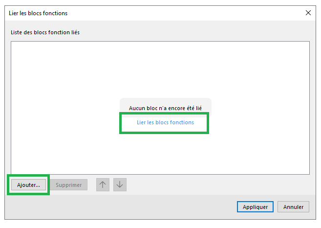 Aucun bloc n’est lié dans la fenêtre suivante. On clique donc sur le bouton Ajouter :