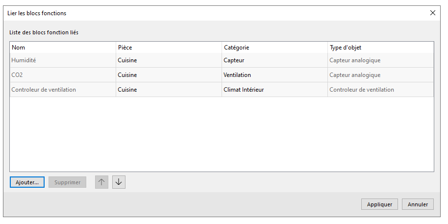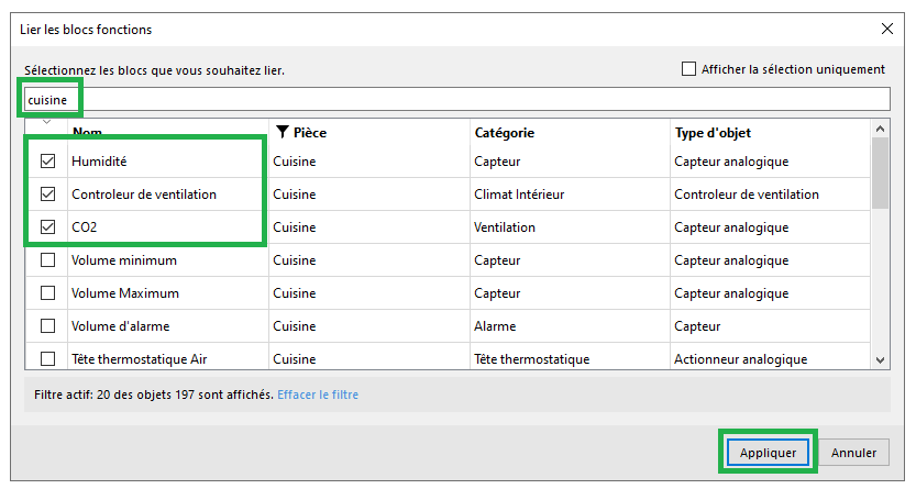 On sélectionne l’hygrométrie (humidité), le capteur de CO2 et le composant contrôleur de ventilation de la cuisine, puis on clique sur Appliquer :